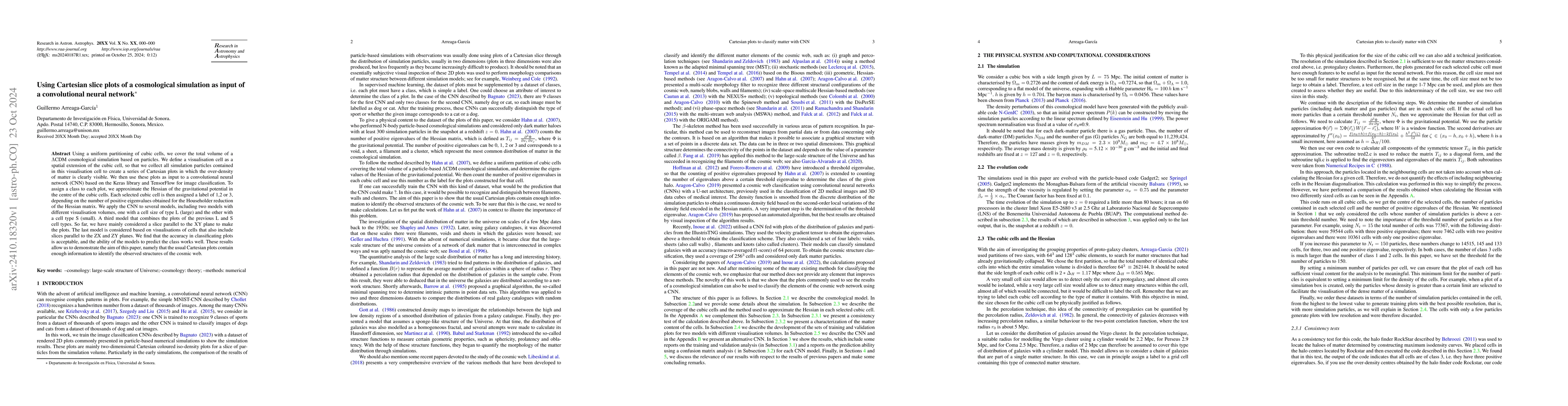 Using a uniform partitioning of cubic cells, we cover the total volume of a $\Lambda$CDM cosmological simulation based on particles. We define a visualisation cell as a spatial extension of the cubic cell, so that we collect all simulation particles contained in this visualisation cell to create a series of Cartesian plots in which the over-density of matter is clearly visible. We then use these plots as input to a convolutional neural network (CNN) based on the Keras library and TensorFlow for image classification. To assign a class to each plot, we approximate the Hessian of the gravitational potential in the centre of the cubic cells. Each selected cubic cell is then assigned a label of 1,2 or 3, depending on the number of positive eigenvalues obtained for the Householder reduction of the Hessian matrix. We apply the CNN to several models, including two models with different visualisation volumes, one with a cell size of type L (large) and the other with a cell type S (small). A third model that combines the plots of the previous L and S cell types. So far, we have mainly considered a slice parallel to the XY plane to make the plots. The last model is considered based on visualisations of cells that also include slices parallel to the ZX and ZY planes. We find that the accuracy in classificating plots is acceptable, and the ability of the models to predict the class works well. These results allow us to demonstrate the aim of this paper, namely that the usual Cartesian plots contain enough information to identify the observed structures of the cosmic web.