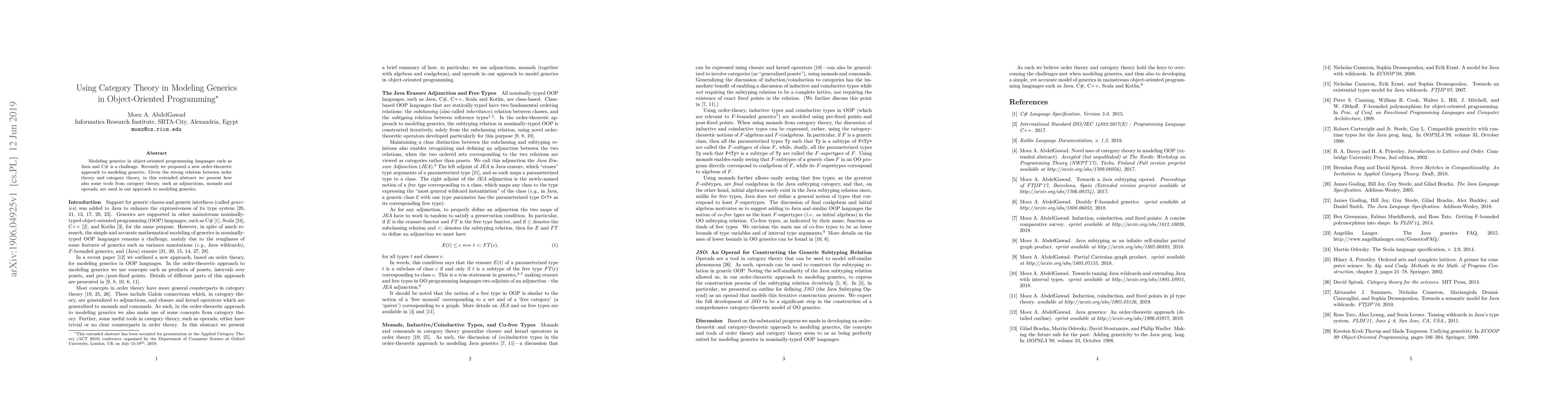 This paper explores the use of category theory tools like adjunctions, monads, and operads to model generics in object-oriented programming languages, building on an existing order-theoretic approach to enhance the modeling of generics in Java and C#.