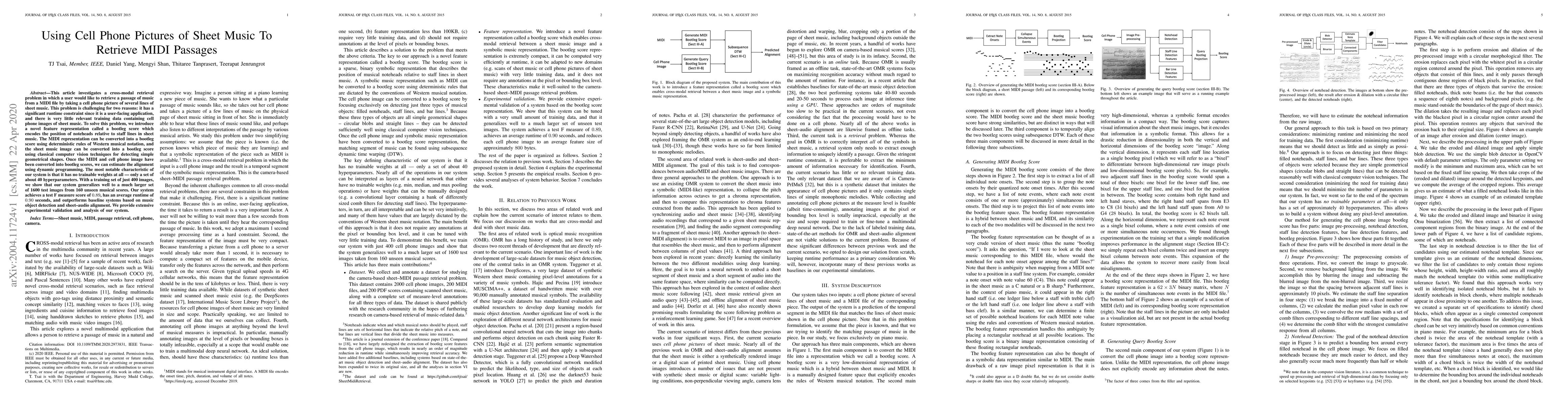 This paper presents a method for cross-modal retrieval of MIDI passages using cell phone images of sheet music, employing a novel "bootleg score" representation to convert both MIDI and images into comparable formats. The system achieves high accuracy and efficiency with minimal training data, outperforming baseline methods.