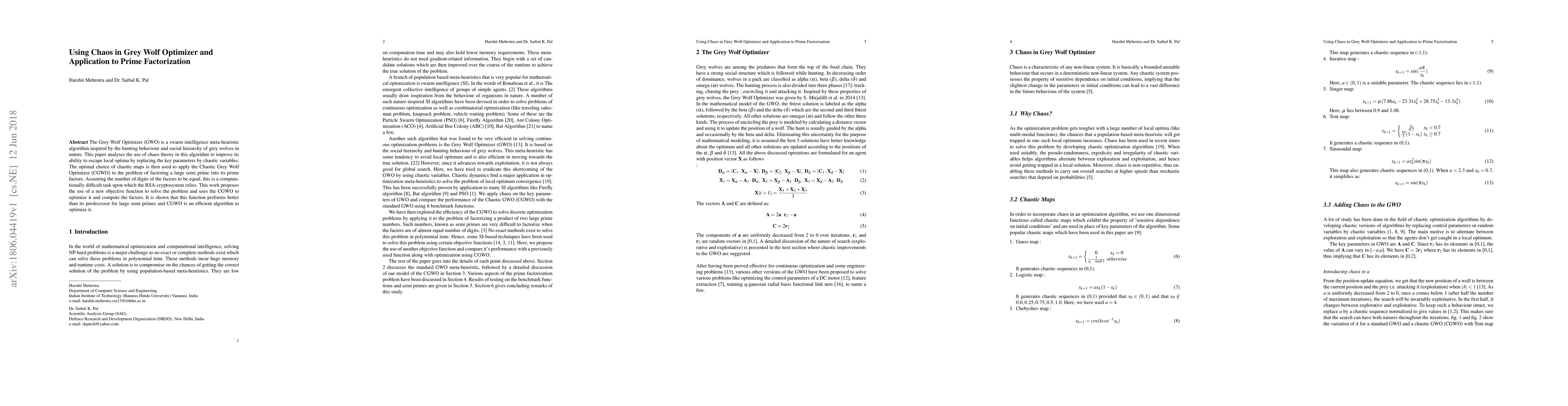 This paper enhances the Grey Wolf Optimizer (GWO) by integrating chaos theory to improve its escape from local optima, proposing a Chaotic Grey Wolf Optimizer (CGWO) for factoring large semi-primes. The CGWO uses a new objective function to optimize the factorization, demonstrating superior performance over traditional methods for large semi-primes.