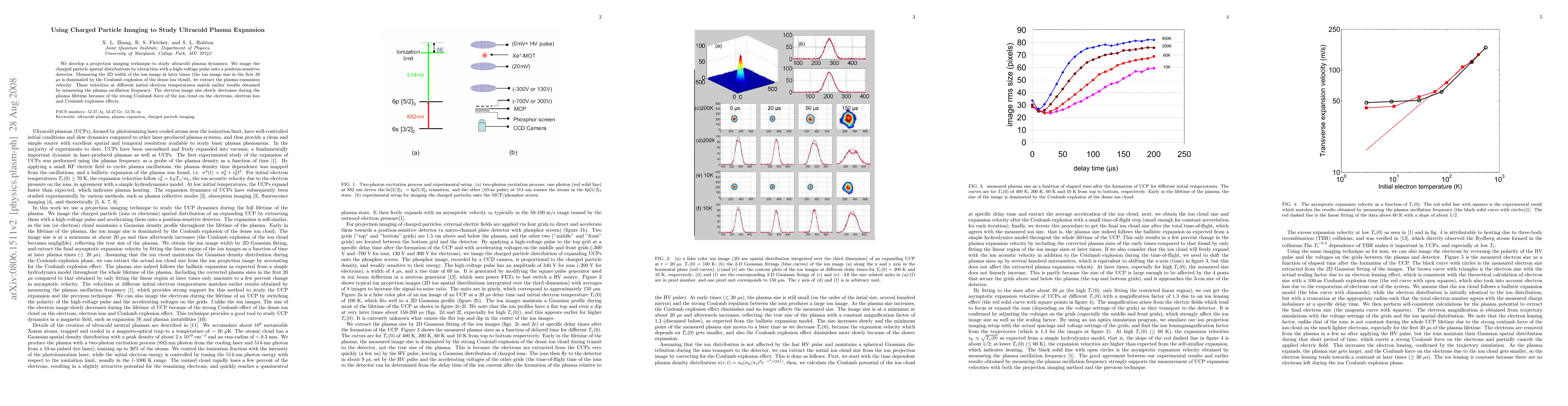 This paper develops a charged particle imaging technique to study ultracold plasma dynamics, measuring expansion velocities via ion image width, which correlates with earlier plasma oscillation frequency results. The electron image size diminishes over time due to Coulomb forces, electron loss, and Coulomb explosion effects.