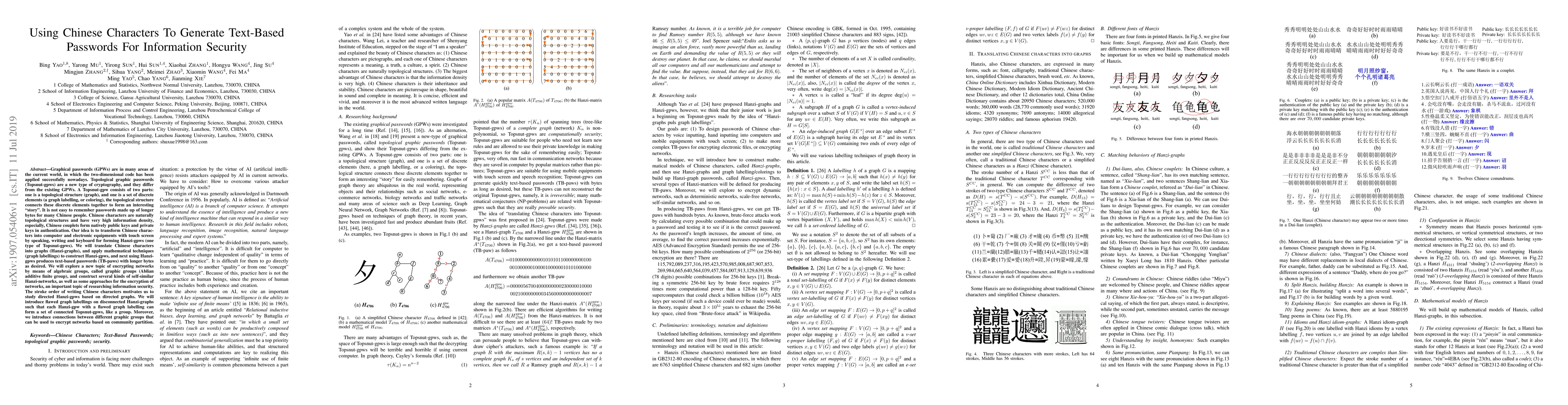 This paper proposes using Chinese characters to generate text-based passwords through Hanzi-graphs and Hanzi-gpws, a new type of topological graphic password. It introduces flawed graph labellings on disconnected Hanzi-graphs to enhance information security.