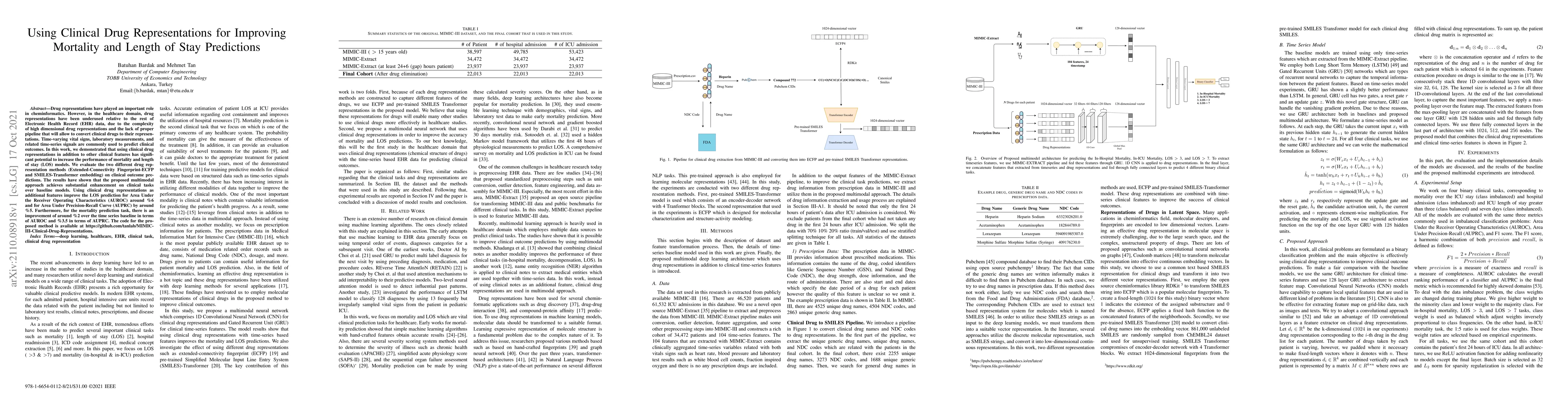 Using clinical drug representations improves mortality and length of stay predictions with significant performance enhancements over baseline models.