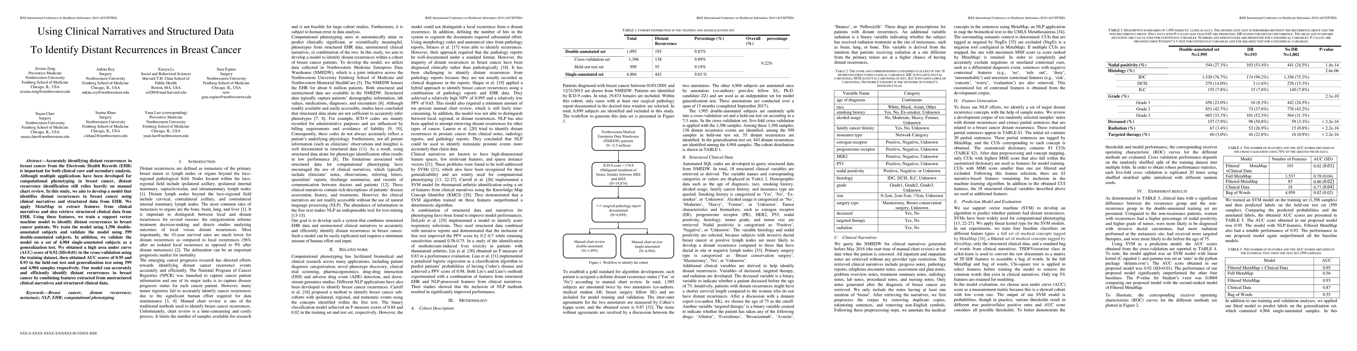 This study develops a model to identify distant recurrences in breast cancer using both clinical narratives and structured data from Electronic Health Records (EHR). The model, trained on 1,396 subjects and validated on 599 and 4,904 subjects, achieved high AUC scores, demonstrating its ability to accurately identify recurrences.