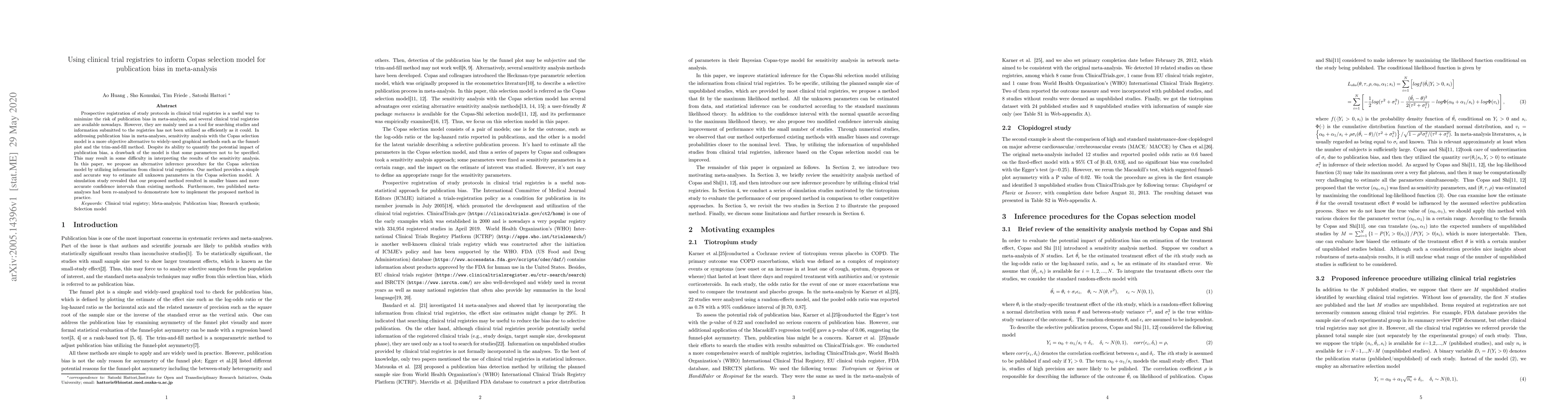 This paper proposes a method to utilize clinical trial registry data to inform the Copas selection model for assessing publication bias in meta-analyses, providing a more objective and accurate alternative to traditional graphical methods. The proposed inference procedure estimates all unknown parameters, resulting in smaller biases and more accurate confidence intervals, as demonstrated by a simulation study and practical re-analyses of published meta-analyses.