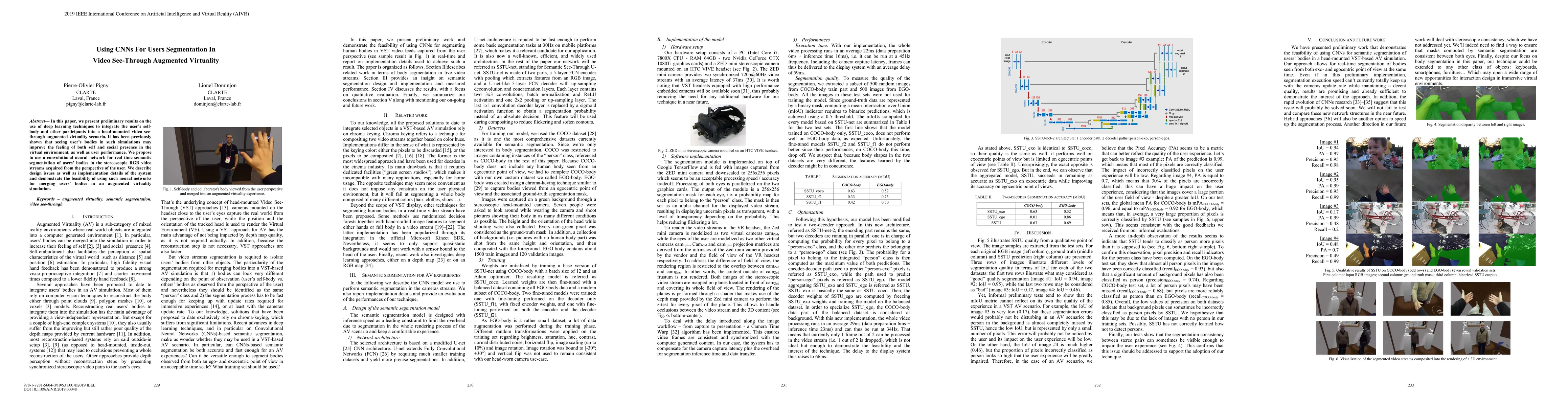 This paper explores using Convolutional Neural Networks (CNNs) to segment users' bodies in real-time for video see-through augmented reality. The method aims to enhance self and social presence, as well as user performance, by integrating users' bodies into the virtual environment as observed from their perspective.