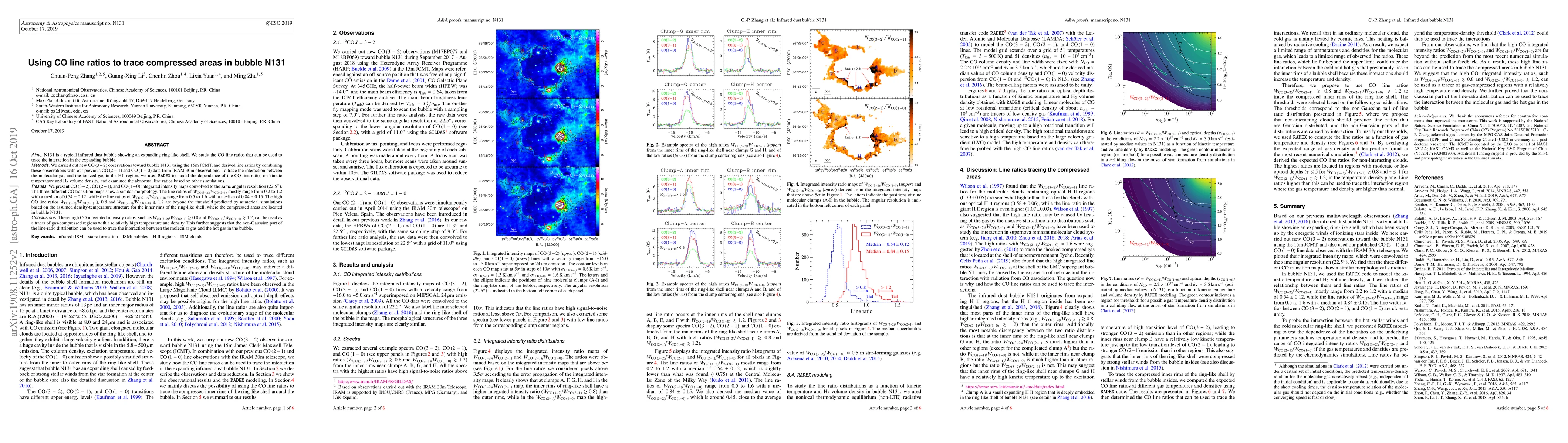 This study uses CO line ratios to identify compressed areas in the expanding infrared dust bubble N131. Observations and modeling reveal high CO line ratios indicating regions of compressed gas with elevated temperature and density, suggesting these ratios can trace interactions between molecular and ionized gas in the bubble.