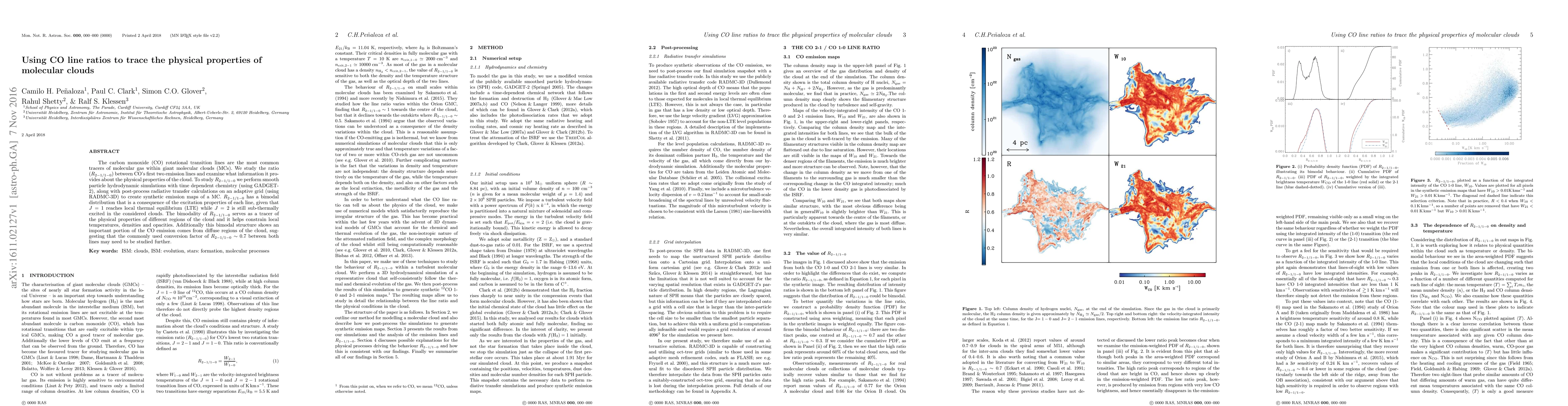 The carbon monoxide (CO) rotational transition lines are the most common tracers of molecular gas within giant molecular clouds (MCs). We study the ratio ($R_{2-1/1-0}$) between CO's first two emission lines and examine what information it provides about the physical properties of the cloud. To study $R_{2-1/1-0}$ we perform smooth particle hydrodynamic simulations with time dependent chemistry (using GADGET-2), along with post-process radiative transfer calculations on an adaptive grid (using RADMC-3D) to create synthetic emission maps of a MC. $R_{2-1/1-0}$ has a bimodal distribution that is a consequence of the excitation properties of each line, given that $J=1$ reaches local thermal equilibrium (LTE) while $J=2$ is still sub-thermally excited in the considered clouds. The bimodality of $R_{2-1/1-0}$ serves as a tracer of the physical properties of different regions of the cloud and it helps constrain local temperatures, densities and opacities. Additionally this bimodal structure shows an important portion of the CO emission comes from diffuse regions of the cloud, suggesting that the commonly used conversion factor of $R_{2-1/1-0}\sim 0.7$ between both lines may need to be studied further.
