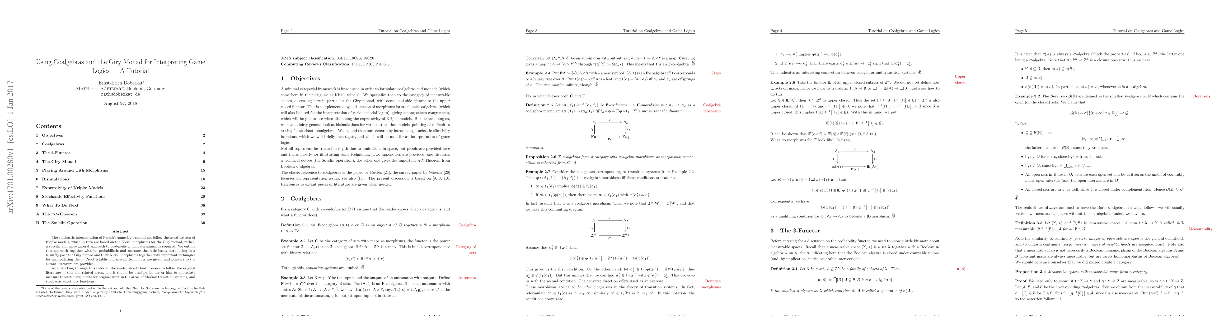 This tutorial introduces the Giry monad and its Kleisli morphisms to interpret Parikh's game logic in a probabilistic framework, diverging from traditional Kripke models. It provides foundational techniques and proofs to aid comprehension of Markov systems and stochastic functions.