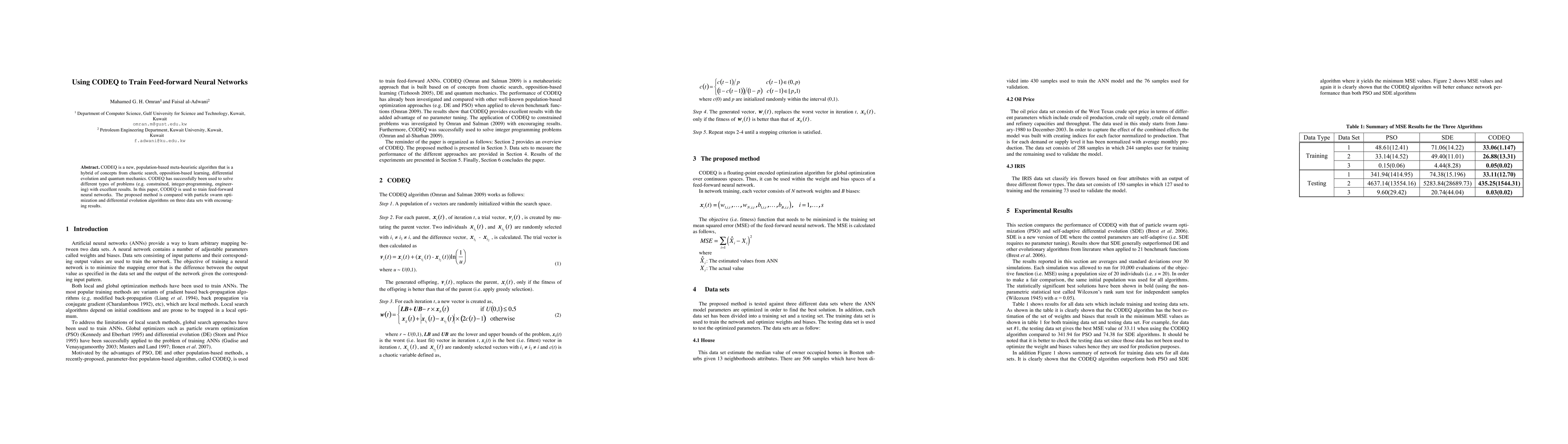 CODEQ is a new, population-based meta-heuristic algorithm that is a hybrid of concepts from chaotic search, opposition-based learning, differential evolution and quantum mechanics. CODEQ has successfully been used to solve different types of problems (e.g. constrained, integer-programming, engineering) with excellent results. In this paper, CODEQ is used to train feed-forward neural networks. The proposed method is compared with particle swarm optimization and differential evolution algorithms on three data sets with encouraging results.