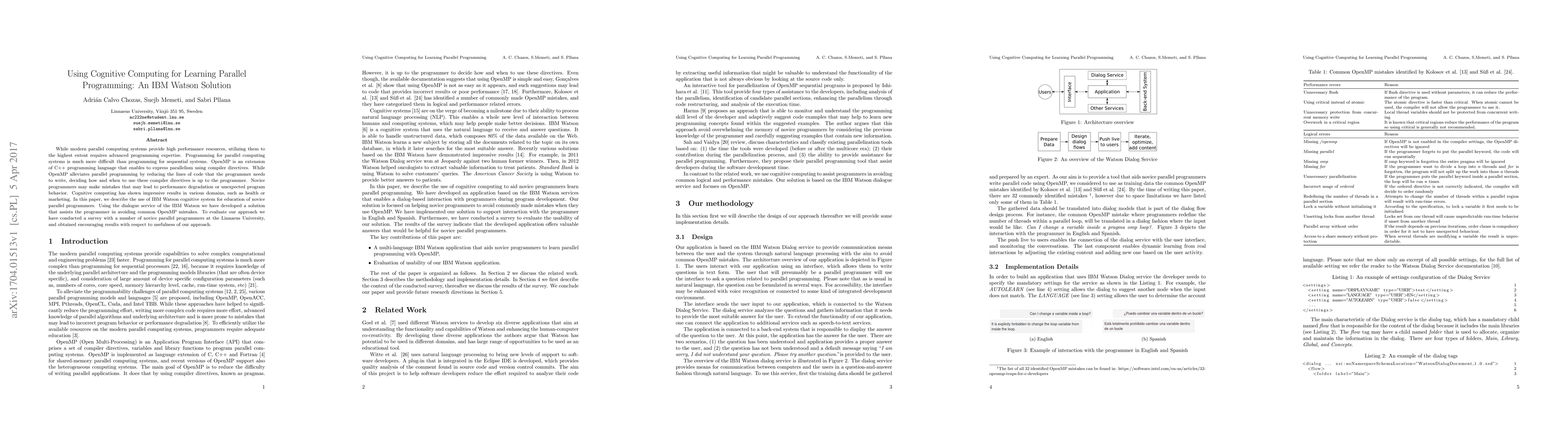 This paper explores using IBM Watson cognitive computing to assist novice programmers in learning parallel programming with OpenMP, aiming to reduce common mistakes and improve performance. Initial survey results from Linnaeus University show promising feedback on the effectiveness of the Watson-based educational solution.