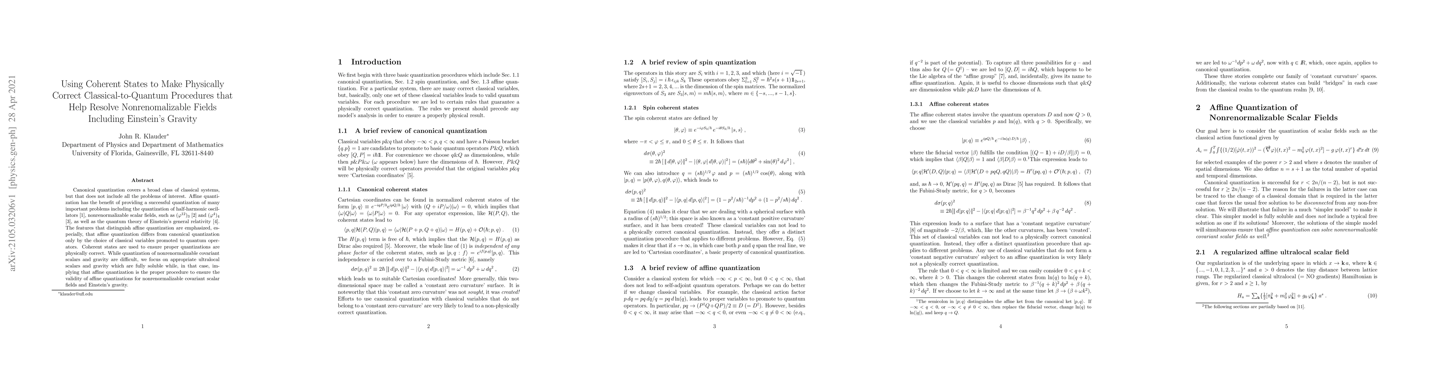 This paper explores affine quantization, emphasizing its advantages over canonical quantization, particularly for nonrenormalizable fields like scalar fields and Einstein's gravity. Coherent states are employed to ensure the physical correctness of these quantizations.