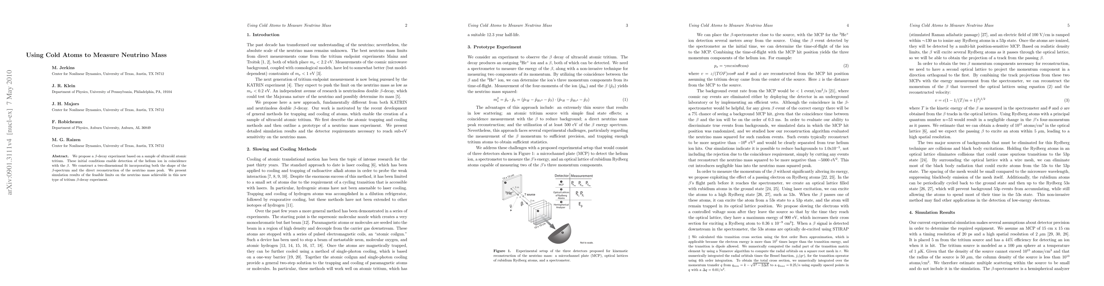 We propose a beta decay experiment based on a sample of ultracold atomic tritium. These initial conditions enable detection of the helium ion in coincidence with the beta. We construct a two-dimensional fit incorporating both the shape of the beta-spectrum and the direct reconstruction of the neutrino mass peak. We present simulation results of the feasible limits on the neutrino mass achievable in this new type of tritium beta-decay experiment.