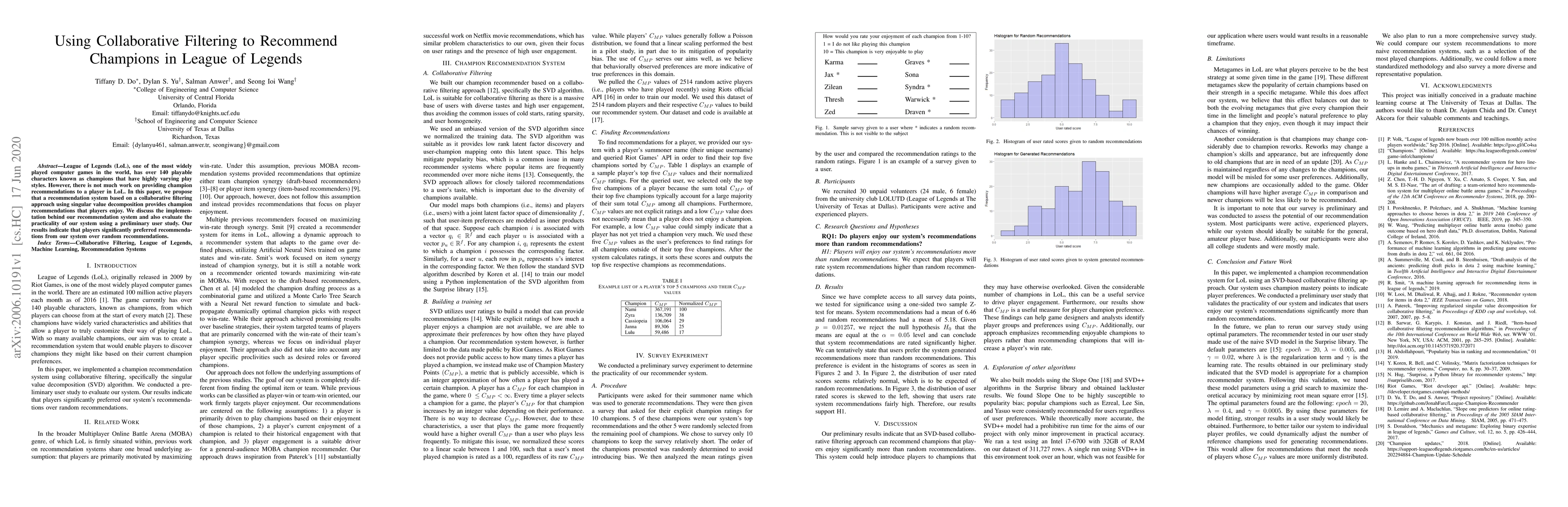This paper proposes a collaborative filtering recommendation system using singular value decomposition to suggest champions in League of Legends, finding that players prefer these recommendations over random ones in a preliminary user study. The system's implementation and evaluation are discussed.