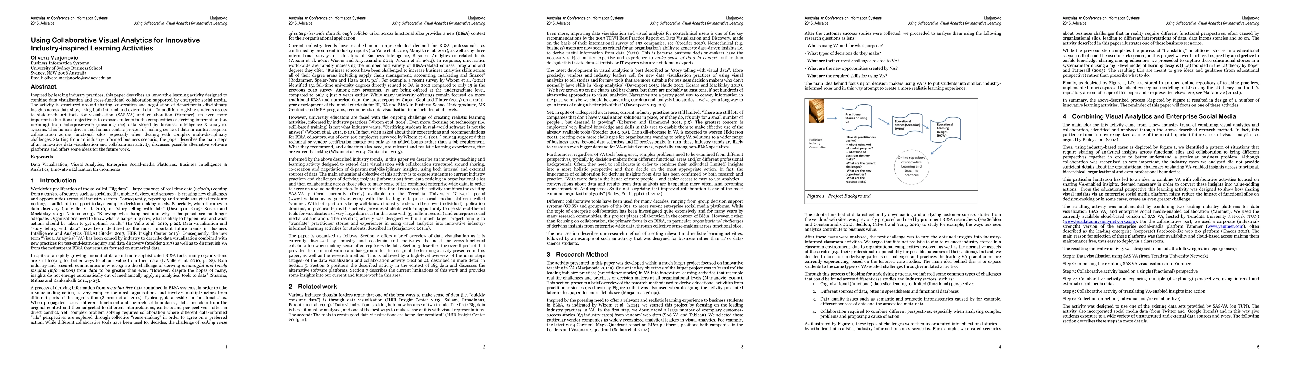 Inspired by the leading industry practices, this paper describes an innovative learning activity that combines data visualization and collaboration structured around sharing, co-creation and negotiation of departmental/disciplinary insights across data silos, using both internal and external data. This activity was designed within a much larger project aiming to translate practitioner stories and experiences in using visual analytics into educational scenarios and innovative industry-informed learning activities for students. In addition to giving students access to state-of-the-art tools for visualization (SAS-VA) and collaboration (Yammer), an even more important educational objective is to expose students to current industry practices with individual data-driven disciplinary insights no longer considered to sufficient when dealing with complex multi-disciplinary challenges. Starting from a data-informed business scenario, the paper describes the main steps of our innovative data visualisation and collaboration activity, discusses possible alternative software platforms and offers some ideas for the future work.