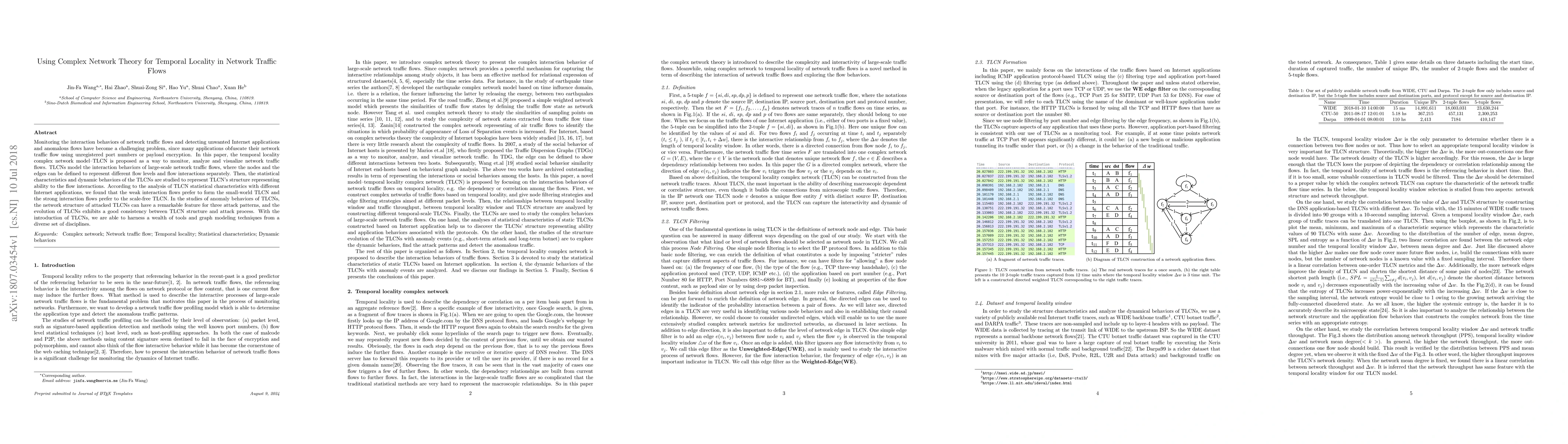 This paper proposes a complex network model called Temporal Locality Complex Network (TLCN) to monitor and analyze network traffic flows, finding that weak interactions form small-world networks while strong interactions form scale-free networks.