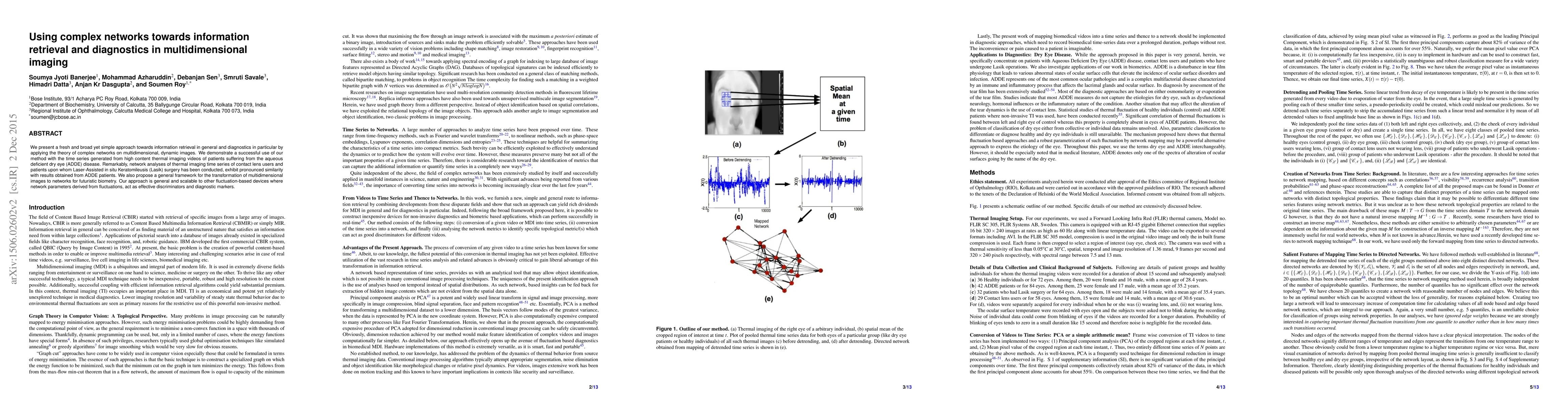 We present a fresh and broad yet simple approach towards information retrieval in general and diagnostics in particular by applying the theory of complex networks on multidimensional, dynamic images. We demonstrate a successful use of our method with the time series generated from high content thermal imaging videos of patients suffering from the aqueous deficient dry eye (ADDE) disease. Remarkably, network analyses of thermal imaging time series of contact lens users and patients upon whom Laser-Assisted in situ Keratomileusis (Lasik) surgery has been conducted, exhibit pronounced similarity with results obtained from ADDE patients. We also propose a general framework for the transformation of multidimensional images to networks for futuristic biometry. Our approach is general and scalable to other fluctuation-based devices where network parameters derived from fluctuations, act as effective discriminators and diagnostic markers.