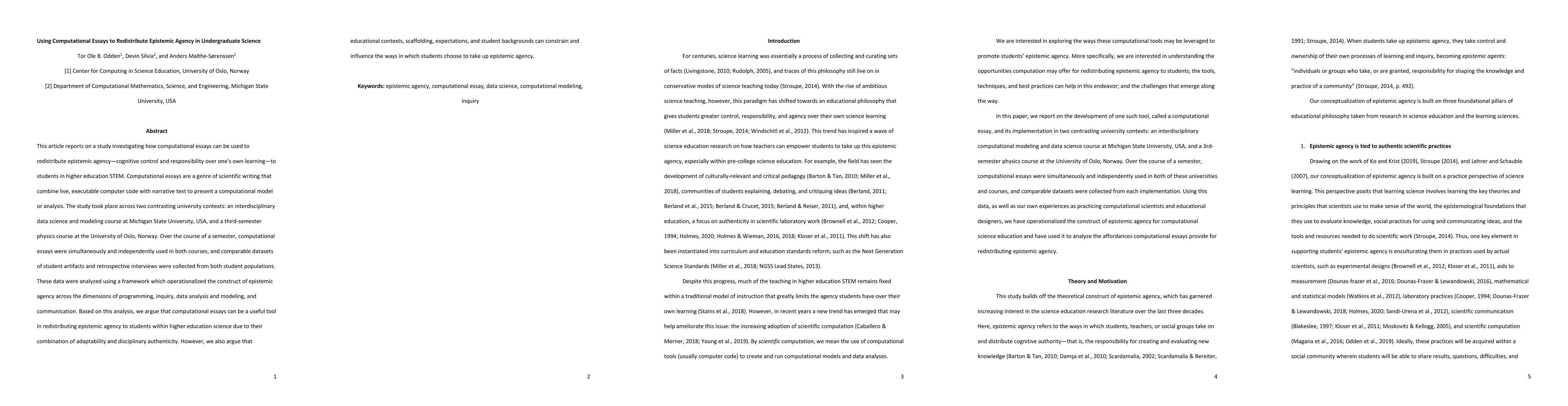 This study explores how computational essays can redistribute epistemic agency in undergraduate science education, finding they effectively empower students through adaptability and disciplinary authenticity, though contextual factors influence their uptake. The research, conducted in data science and physics courses, used student artifacts and interviews to analyze the impact across different university settings.