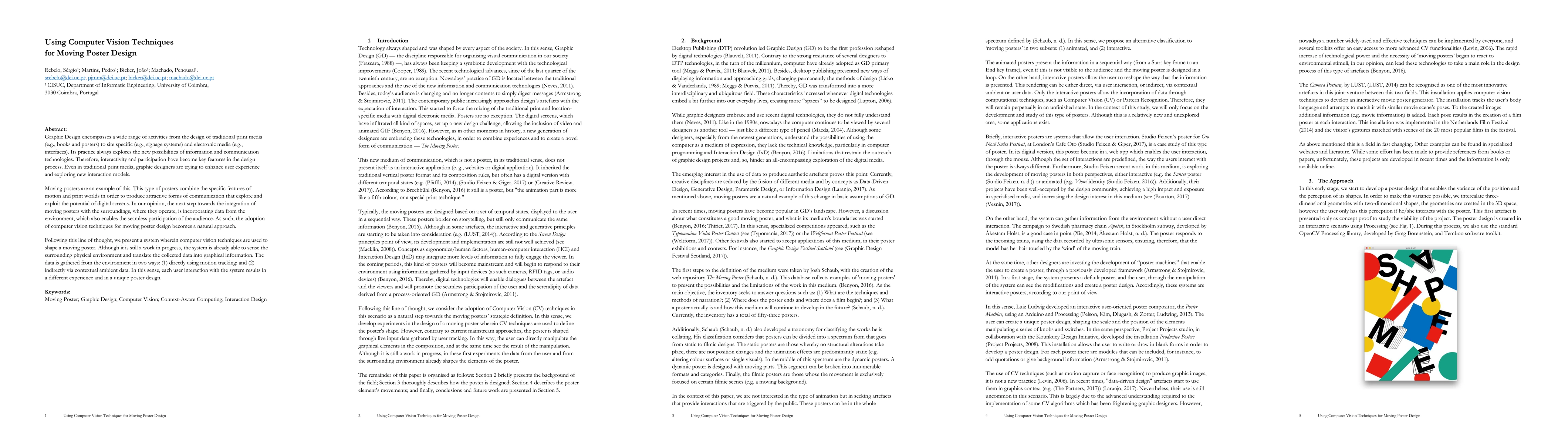 This paper explores the integration of computer vision techniques to design interactive moving posters that adapt to the environment and user interactions, creating unique experiences each time. The system uses motion tracking and ambient data to dynamically generate graphical content, merging motion with traditional print media.