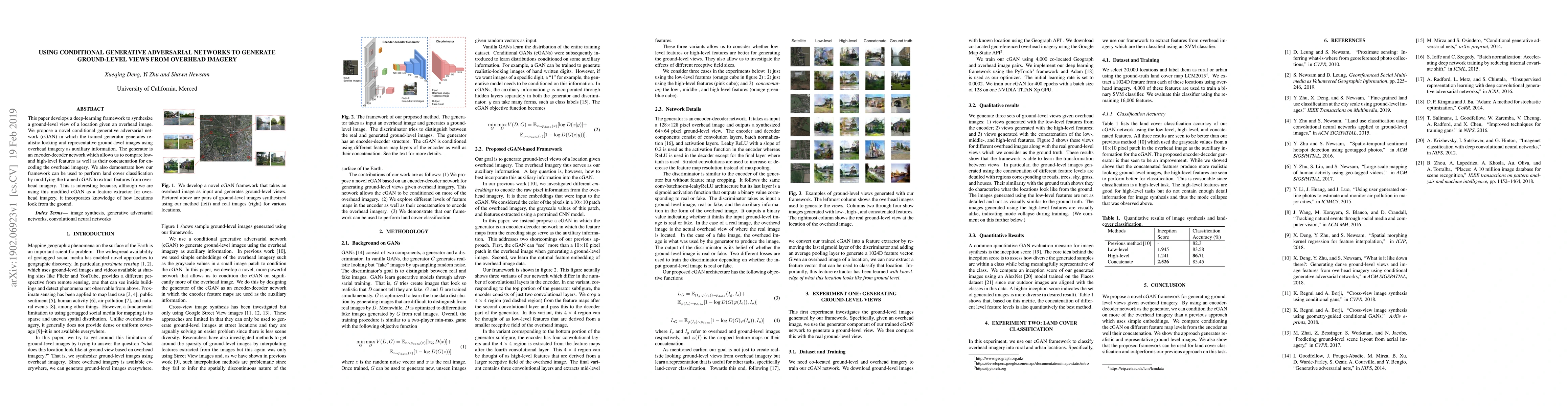 This paper introduces a conditional generative adversarial network (cGAN) to synthesize realistic ground-level views from overhead imagery, utilizing an encoder-decoder architecture to compare low- and high-level features. The framework also demonstrates its potential for land cover classification by leveraging the cGAN's learned ground-level knowledge.