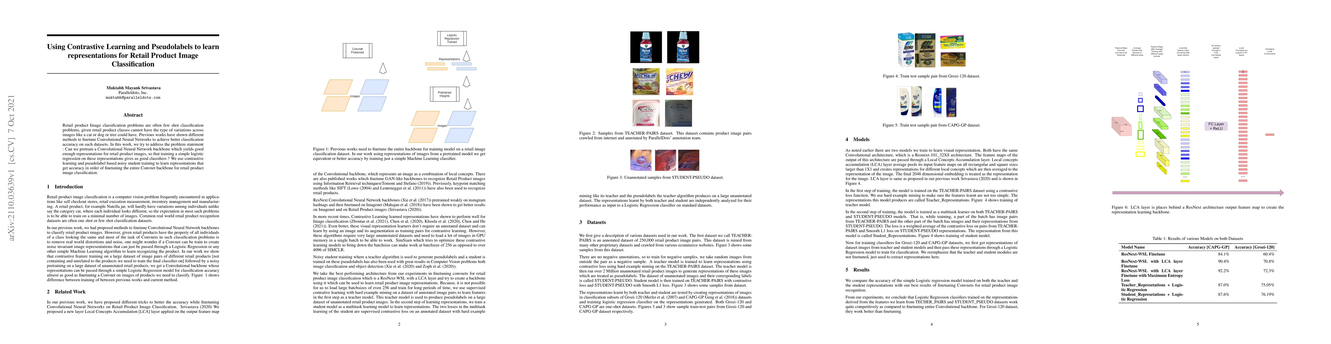 Retail product Image classification problems are often few shot classification problems, given retail product classes cannot have the type of variations across images like a cat or dog or tree could have. Previous works have shown different methods to finetune Convolutional Neural Networks to achieve better classification accuracy on such datasets. In this work, we try to address the problem statement : Can we pretrain a Convolutional Neural Network backbone which yields good enough representations for retail product images, so that training a simple logistic regression on these representations gives us good classifiers ? We use contrastive learning and pseudolabel based noisy student training to learn representations that get accuracy in order of finetuning the entire Convnet backbone for retail product image classification.