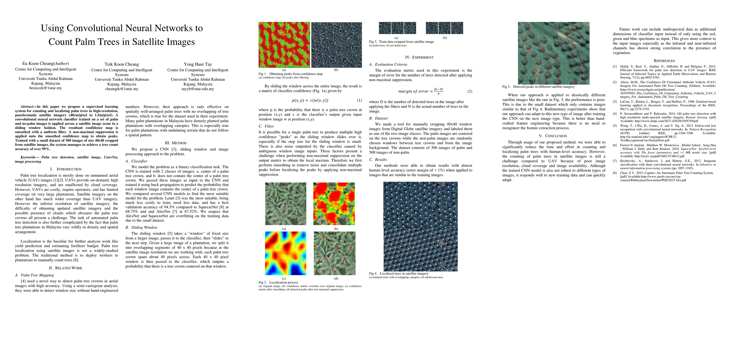 This paper presents a supervised learning system using convolutional neural networks to count and localize palm trees in high-resolution satellite images. The system achieves over 99% accuracy in tree counting, trained on a dataset of 500 cropped 40x40 pixel images.