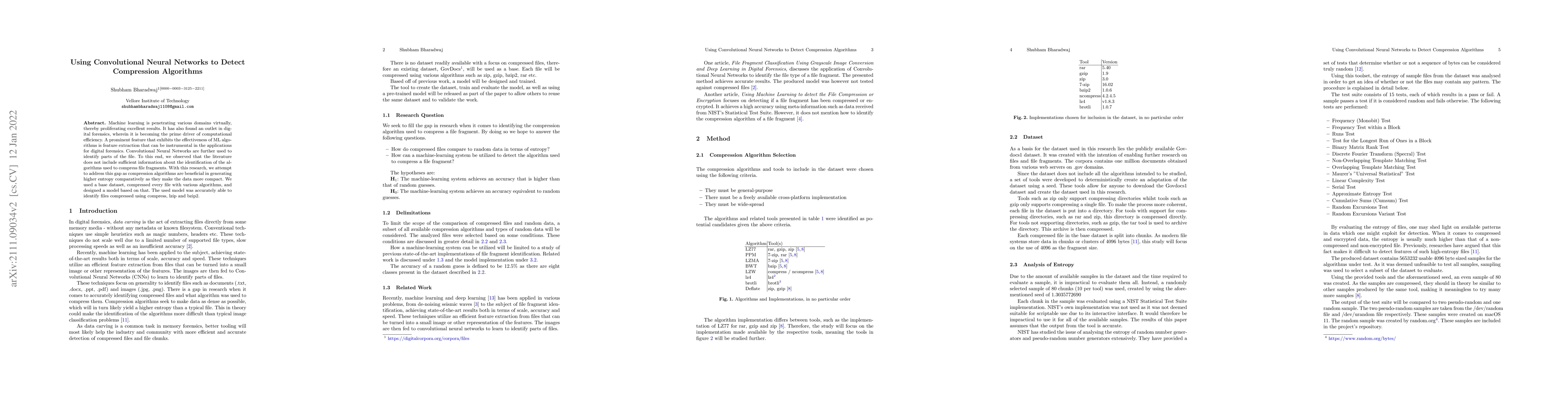 This research explores the use of Convolutional Neural Networks (CNNs) to detect compression algorithms in digital forensics. The study successfully identified files compressed using compress, lzip, and bzip2, addressing a gap in literature on the identification of compression algorithms.
