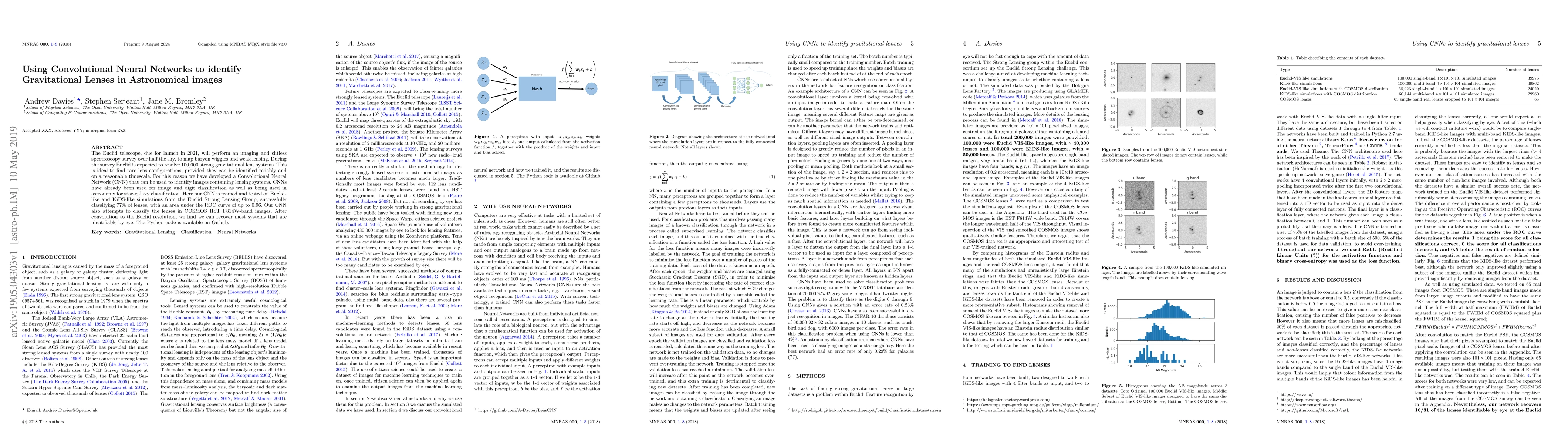 This paper develops a Convolutional Neural Network (CNN) to identify gravitational lenses in astronomical images, achieving a 77% classification rate and an area under the ROC curve of 0.96 on Euclid-like simulations. The CNN also successfully identifies lens systems in COSMOS HST images, demonstrating its potential for the Euclid telescope's survey.