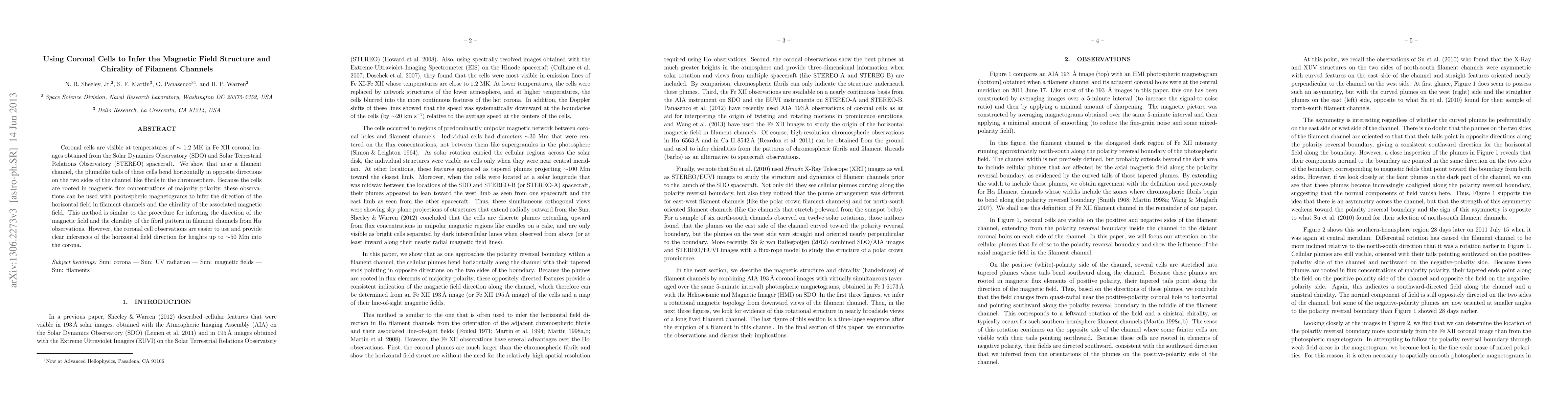 This paper demonstrates that coronal cells observed in Fe XII images from SDO and STEREO can be used to infer the horizontal magnetic field direction and chirality in filament channels, providing a clear method for understanding coronal magnetic structures up to 50 Mm high. This approach complements H-alpha observations by offering easier and more direct insights into the magnetic field in filament channels.