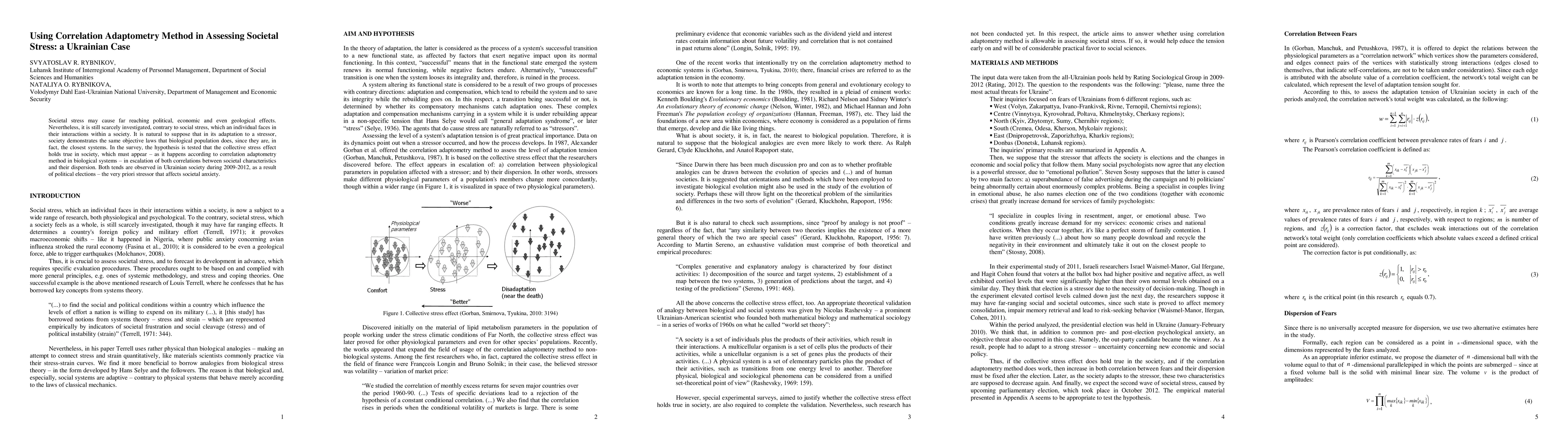 Societal stress may cause far reaching political, economic and even geological effects. Nevertheless, it is still scarcely investigated, contrary to social stress, which an individual faces in their interactions within a society. It is natural to suppose that in its adaptation, society demonstrates the same objective laws that biological population does, since they are, in fact, the closest systems. In the survey, the hypothesis is tested that the collective stress effect holds true in society, which must appear (as it happens according to correlation adaptometry method in biological systems) in escalation of both correlations between societal characteristics and their dispersion. Both tends are observed in Ukrainian society during 2009-2012, as a result of political elections that affect societal anxiety.