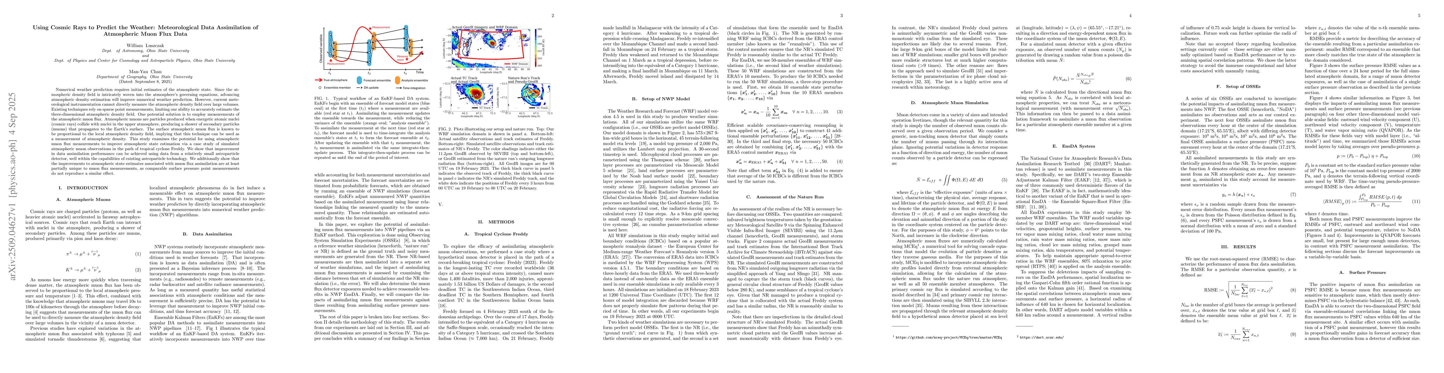 Numerical weather prediction requires initial estimates of the atmospheric state. Since the atmospheric density field is intricately woven into the atmosphere's governing equations, advancing atmospheric density estimation will improve numerical weather prediction. However, current meteorological instrumentation cannot directly measure the atmospheric density field over large volumes. Existing techniques rely on sparse point measurements, limiting our ability to accurately estimate the three-dimensional atmospheric density field. One potential solution is to employ measurements of the atmospheric muon flux. Atmospheric muons are particles produced when energetic atomic nuclei (cosmic rays) collide with nuclei in the upper atmosphere, producing a shower of secondary particles (muons) that propagates to the Earth's surface. The surface atmospheric muon flux is known to be proportional to the local atmospheric density field, implying that this technique can be used as a measurement of atmospheric density. This study examines the potential for using atmospheric muon flux measurements to improve atmospheric state estimation via a case study of simulated atmospheric muon observations in the path of tropical cyclone Freddy. We show that improvement in data assimilation performance can be achieved using data from a relatively small astroparticle detector, well within the capabilities of existing astroparticle technology. We additionally show that the improvements to atmospheric state estimates associated with muon flux assimilation are at least partially unique to muon flux measurements, as comparable surface pressure point measurements do not reproduce a similar effect.