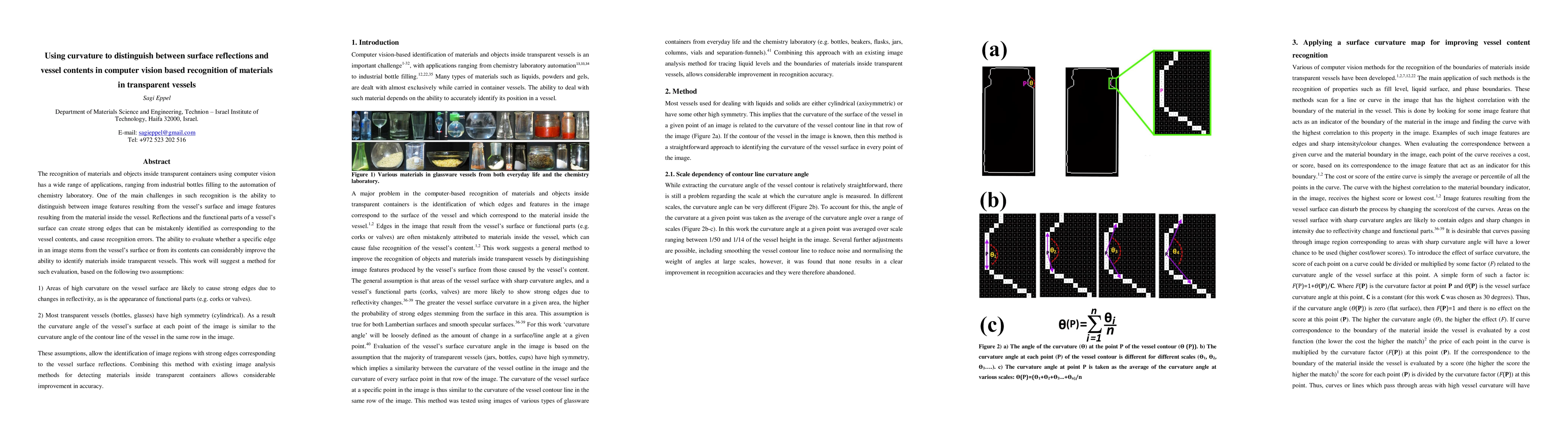 A new method uses curvature to distinguish between surface reflections and vessel contents in transparent vessels, improving material recognition accuracy.