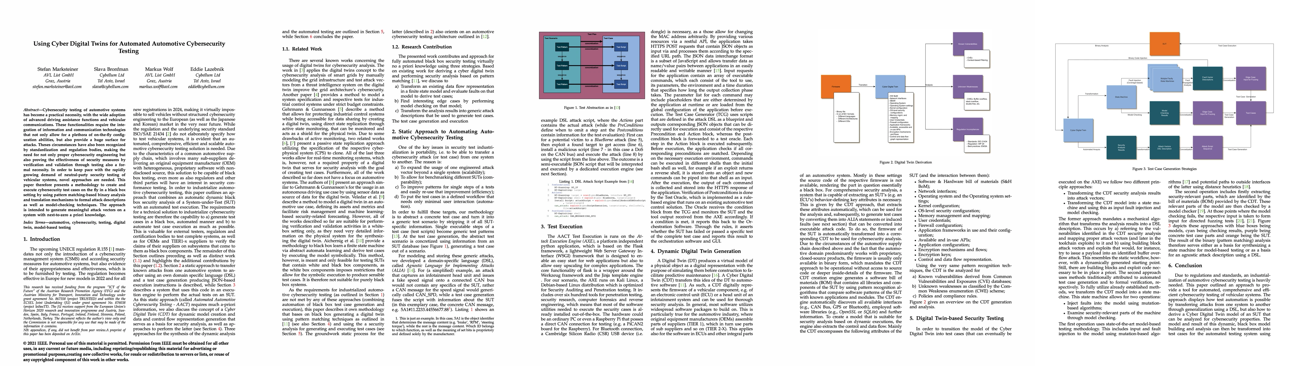 This paper proposes a methodology for automated cybersecurity testing of automotive systems using cyber digital twins, employing pattern matching-based binary analysis and model-checking techniques to generate attack vectors with minimal prior knowledge, addressing the growing need for neutral-party security testing.