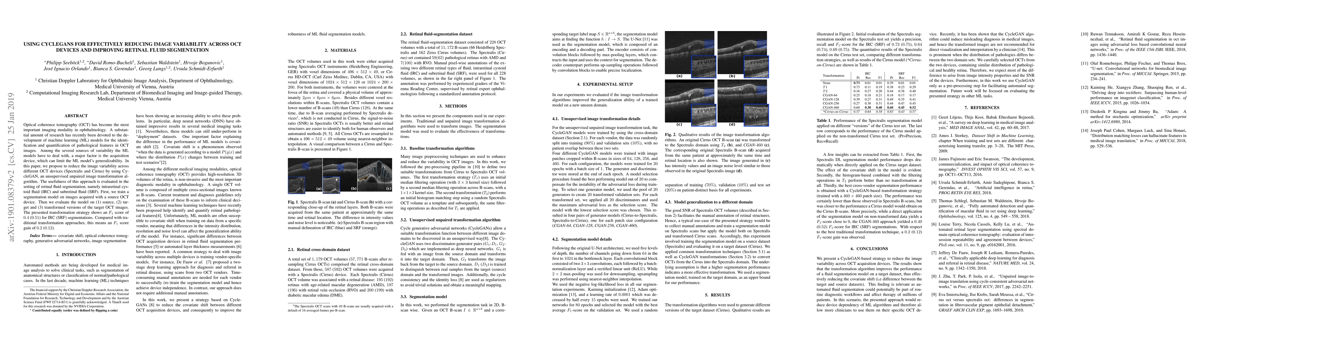 This paper uses CycleGANs to reduce image variability across different OCT devices, enhancing the generalizability of retinal fluid segmentation models. The approach shows an improvement in F1 score by 0.2 for intraretinal cystoid fluid and 0.12 for subretinal fluid segmentation, outperforming traditional methods.