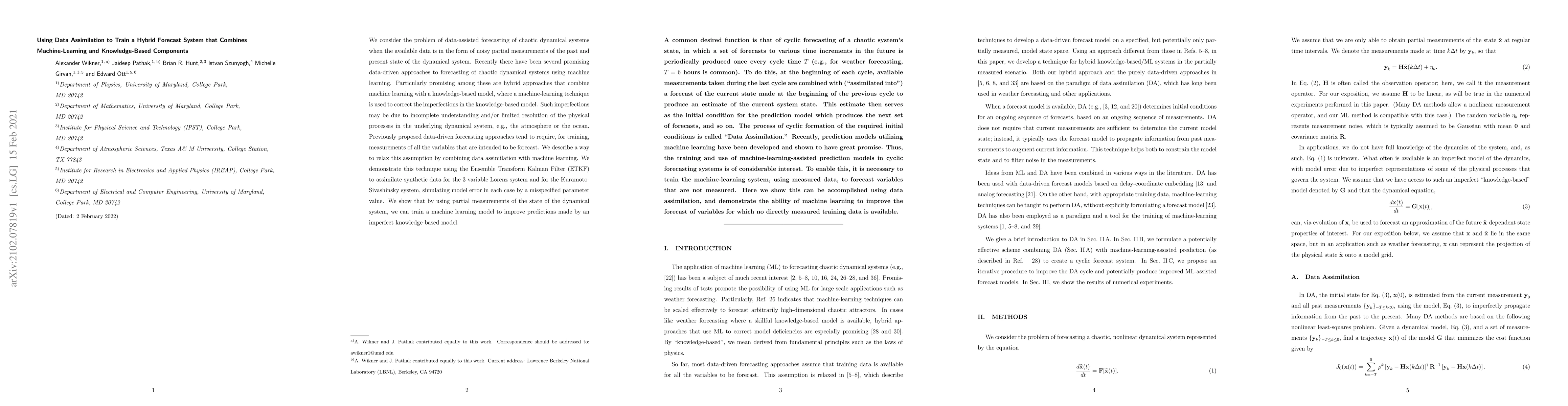This paper proposes a hybrid forecast system combining machine learning and knowledge-based models, trained using data assimilation techniques to handle noisy partial measurements. The Ensemble Transform Kalman Filter (ETKF) is used to assimilate synthetic data, demonstrating improved predictions for chaotic systems like the Lorenz and Kuramoto-Sivashinsky systems.
