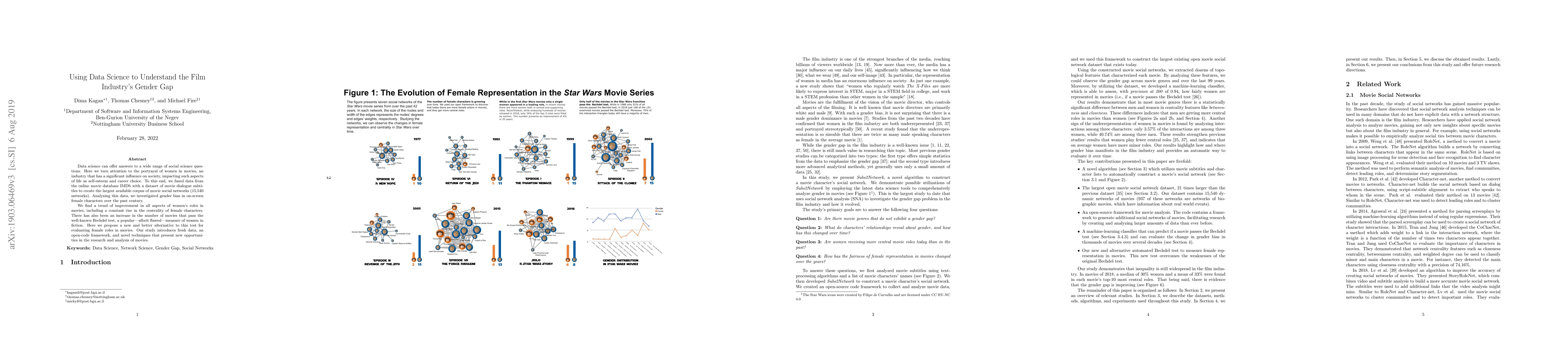 Data science can offer answers to a wide range of social science questions. Here we turn attention to the portrayal of women in movies, an industry that has a significant influence on society, impacting such aspects of life as self-esteem and career choice. To this end, we fused data from the online movie database IMDb with a dataset of movie dialogue subtitles to create the largest available corpus of movie social networks (15,540 networks). Analyzing this data, we investigated gender bias in on-screen female characters over the past century. We find a trend of improvement in all aspects of women`s roles in movies, including a constant rise in the centrality of female characters. There has also been an increase in the number of movies that pass the well-known Bechdel test, a popular--albeit flawed--measure of women in fiction. Here we propose a new and better alternative to this test for evaluating female roles in movies. Our study introduces fresh data, an open-code framework, and novel techniques that present new opportunities in the research and analysis of movies.