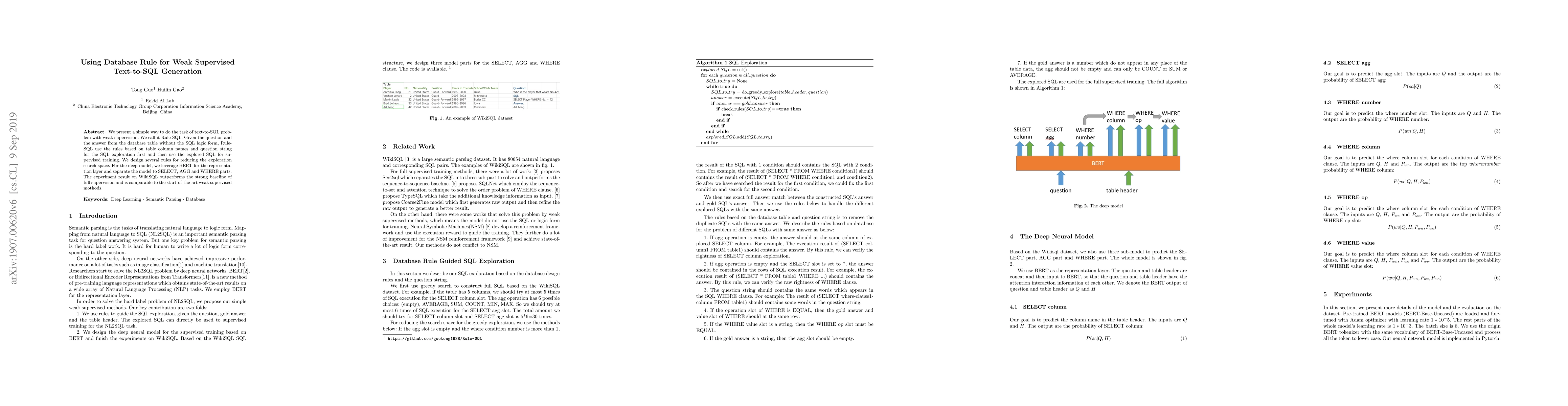 We present a simple way to do the task of text-to-SQL problem with weak supervision. We call it Rule-SQL. Given the question and the answer from the database table without the SQL logic form, Rule-SQL use the rules based on table column names and question string for the SQL exploration first and then use the explored SQL for supervised training. We design several rules for reducing the exploration search space. For the deep model, we leverage BERT for the representation layer and separate the model to SELECT, AGG and WHERE parts. The experiment result on WikiSQL outperforms the strong baseline of full supervision and is comparable to the start-of-the-art weak supervised mothods.