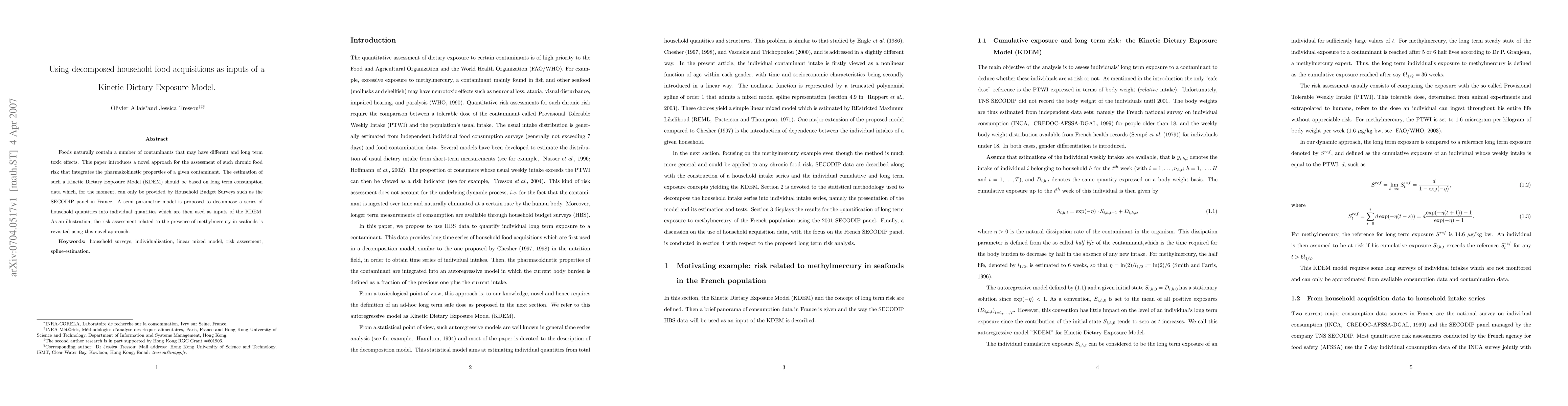 Foods naturally contain a number of contaminants that may have different and long term toxic effects. This paper introduces a novel approach for the assessment of such chronic food risk that integrates the pharmacokinetic properties of a given contaminant. The estimation of such a Kinetic Dietary Exposure Model (KDEM) should be based on long term consumption data which, for the moment, can only be provided by Household Budget Surveys such as the SECODIP panel in France. A semi parametric model is proposed to decompose a series of household quantities into individual quantities which are then used as inputs of the KDEM. As an illustration, the risk assessment related to the presence of methyl mercury in seafood is revisited using this novel approach.