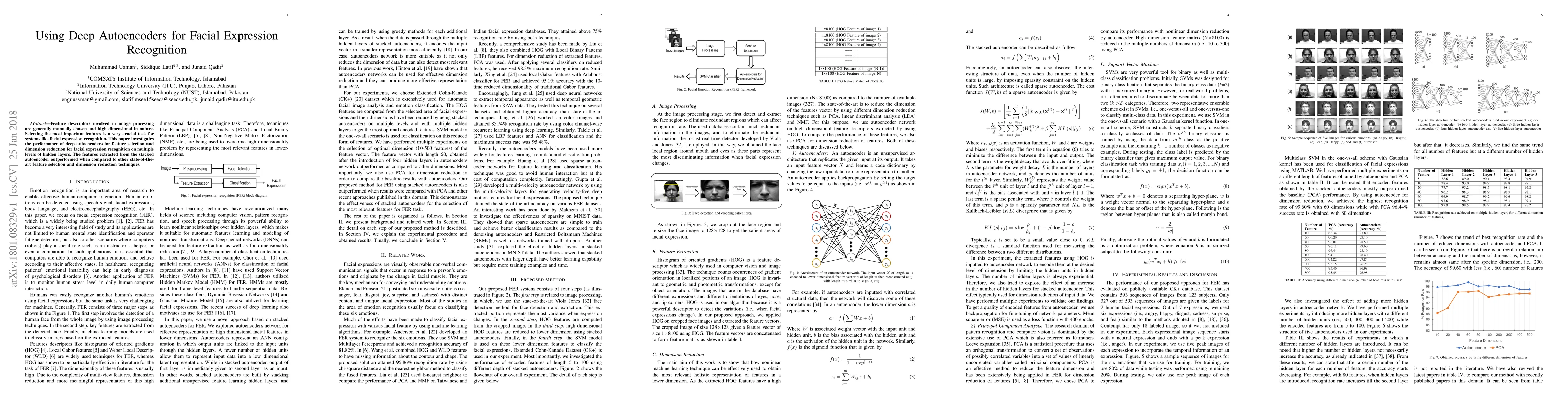 This paper explores deep autoencoders for feature selection and dimension reduction in facial expression recognition, demonstrating that features extracted from stacked autoencoders outperform other state-of-the-art techniques. The study highlights the effectiveness of deep learning in automatically identifying crucial features for facial expression recognition.