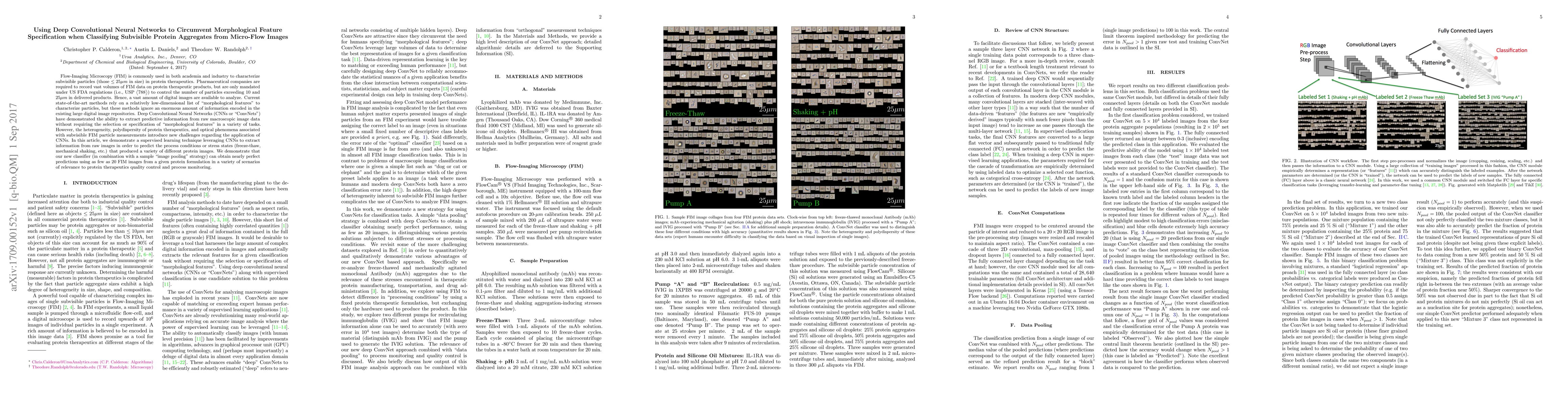 Flow-Imaging Microscopy (FIM) is commonly used in both academia and industry to characterize subvisible particles (those $\le 25 \mu m$ in size) in protein therapeutics. Pharmaceutical companies are required to record vast volumes of FIM data on protein therapeutic products, but are only mandated under US FDA regulations (i.e., USP $\big \langle 788 \big \rangle$) to control the number of particles exceeding $10$ and $25 \mu m$ in delivered products. Hence, a vast amount of digital images are available to analyze. Current state-of-the-art methods rely on a relatively low-dimensional list of "morphological features" to characterize particles, but these methods ignore an enormous amount of information encoded in the existing large digital image repositories. Deep Convolutional Neural Networks (CNNs or "ConvNets") have demonstrated the ability to extract predictive information from raw macroscopic image data without requiring the selection or specification of "morphological features" in a variety of tasks. However, the heterogeneity, polydispersity of protein therapeutics, and optical phenomena associated with subvisible FIM particle measurements introduce new challenges regarding the application of CNNs to FIM image analysis. In this article, we demonstrate a supervised learning technique leveraging CNNs to extract information from raw images in order to predict the process conditions or stress states (freeze-thaw, mechanical shaking, etc.) that produced a variety of different protein images. We demonstrate that our new classifier (in combination with a sample "image pooling" strategy) can obtain nearly perfect predictions using as few as 20 FIM images from a given protein formulation in a variety of scenarios of relevance to protein therapeutics quality control and process monitoring.