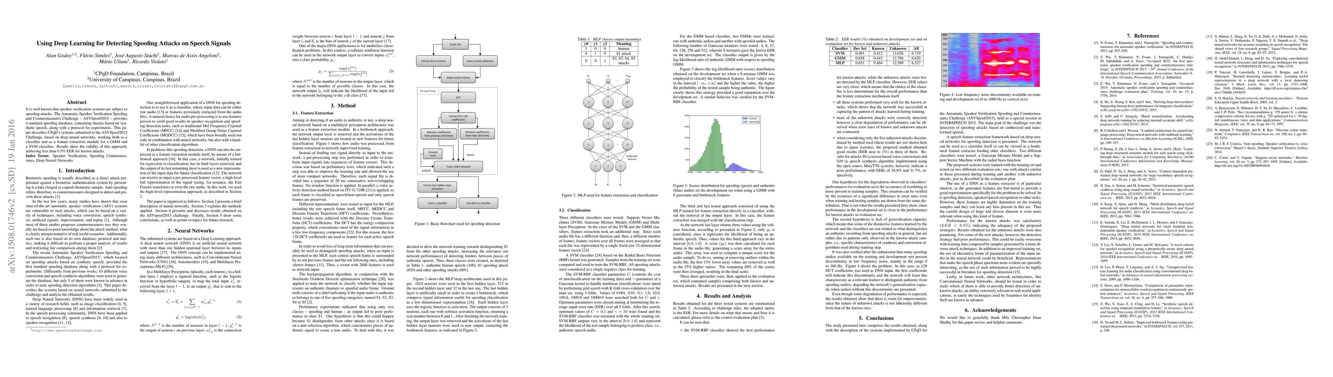 This paper presents deep learning-based systems for detecting spoofing attacks on speech signals, using deep neural networks for both classification and feature extraction. The proposed approach achieved less than 0.5% Equal Error Rate (EER) for known attacks in the ASVSpoof2015 Challenge.