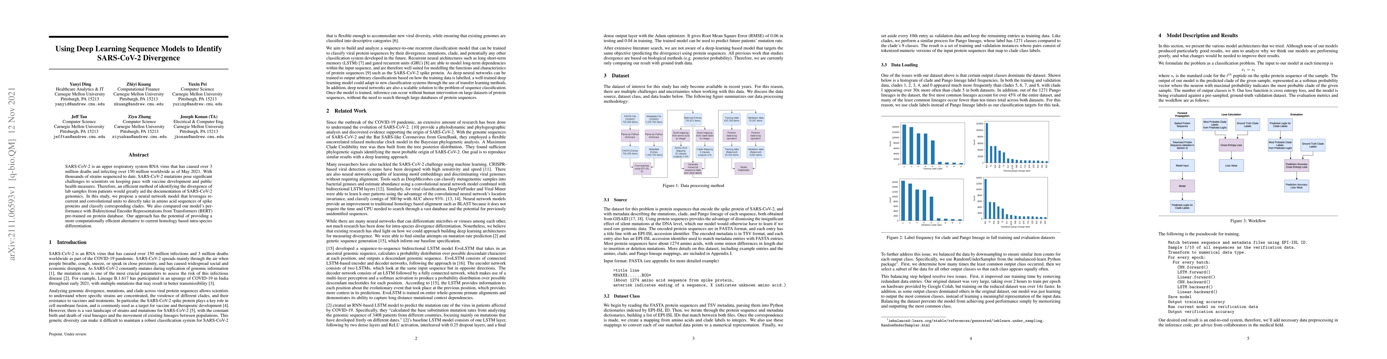 This study proposes a deep learning sequence model using recurrent and convolutional units to classify SARS-CoV-2 clades based on spike protein sequences, offering a computationally efficient alternative to traditional homology-based methods. The model's performance is compared to BERT pre-trained on protein databases, demonstrating its potential to aid in tracking viral divergence.