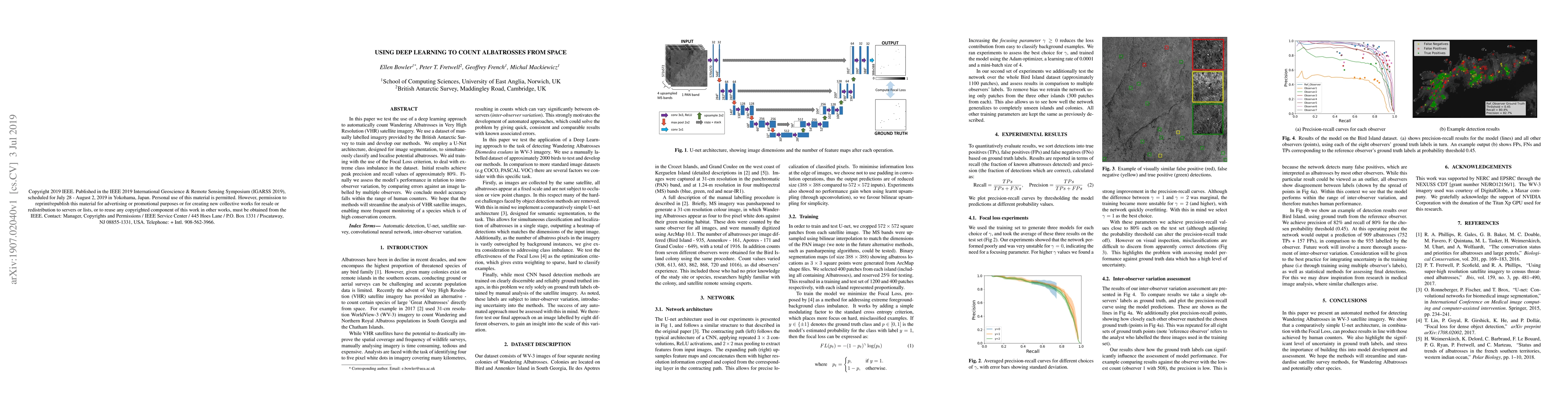 In this paper we test the use of a deep learning approach to automatically count Wandering Albatrosses in Very High Resolution (VHR) satellite imagery. We use a dataset of manually labelled imagery provided by the British Antarctic Survey to train and develop our methods. We employ a U-Net architecture, designed for image segmentation, to simultaneously classify and localise potential albatrosses. We aid training with the use of the Focal Loss criterion, to deal with extreme class imbalance in the dataset. Initial results achieve peak precision and recall values of approximately 80%. Finally we assess the model's performance in relation to inter-observer variation, by comparing errors against an image labelled by multiple observers. We conclude model accuracy falls within the range of human counters. We hope that the methods will streamline the analysis of VHR satellite images, enabling more frequent monitoring of a species which is of high conservation concern.