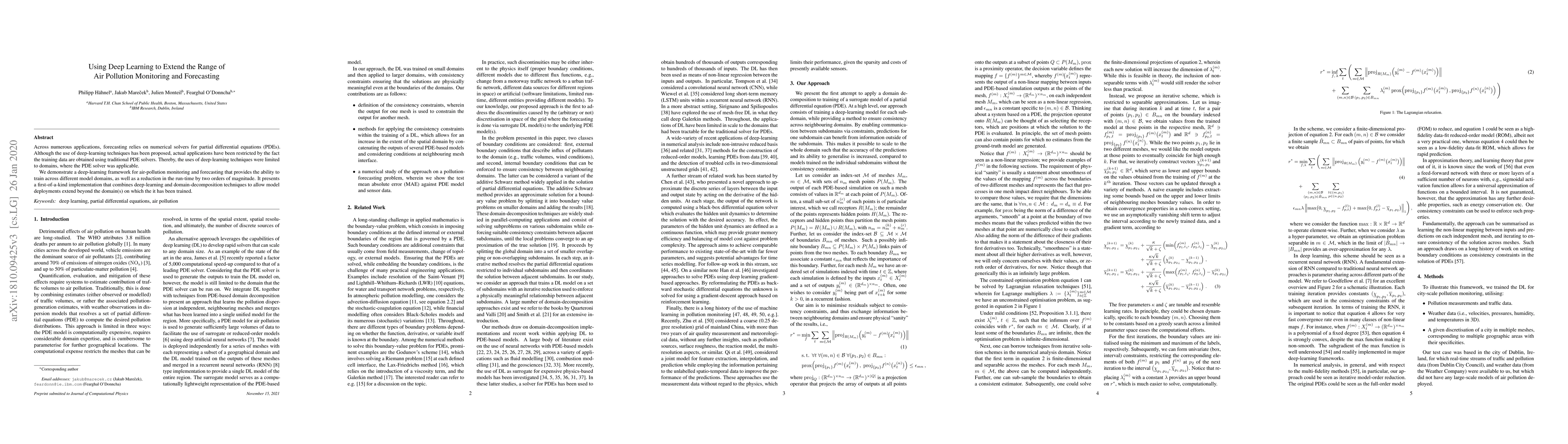 Across numerous applications, forecasting relies on numerical solvers for partial differential equations (PDEs). Although the use of deep-learning techniques has been proposed, actual applications have been restricted by the fact the training data are obtained using traditional PDE solvers. Thereby, the uses of deep-learning techniques were limited to domains, where the PDE solver was applicable. We demonstrate a deep-learning framework for air-pollution monitoring and forecasting that provides the ability to train across different model domains, as well as a reduction in the run-time by two orders of magnitude. It presents a first-of-a-kind implementation that combines deep-learning and domain-decomposition techniques to allow model deployments extend beyond the domain(s) on which the it has been trained.