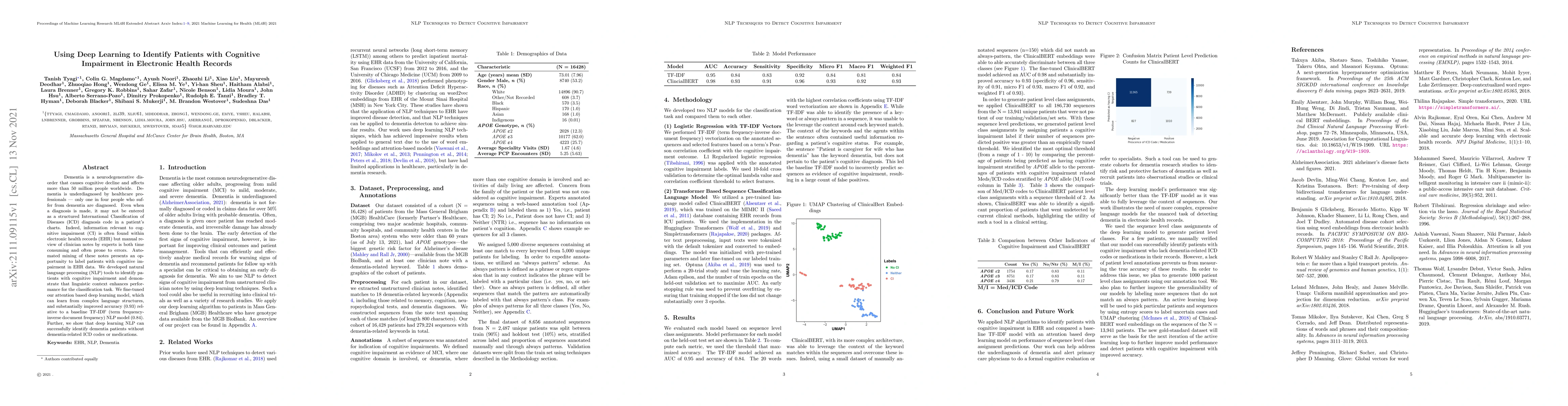 This study uses deep learning and natural language processing to automate the identification of patients with cognitive impairment in electronic health records, achieving a substantial improvement in accuracy (0.93) compared to a baseline NLP model (0.84). The approach successfully identifies dementia patients even when traditional diagnosis codes are absent.