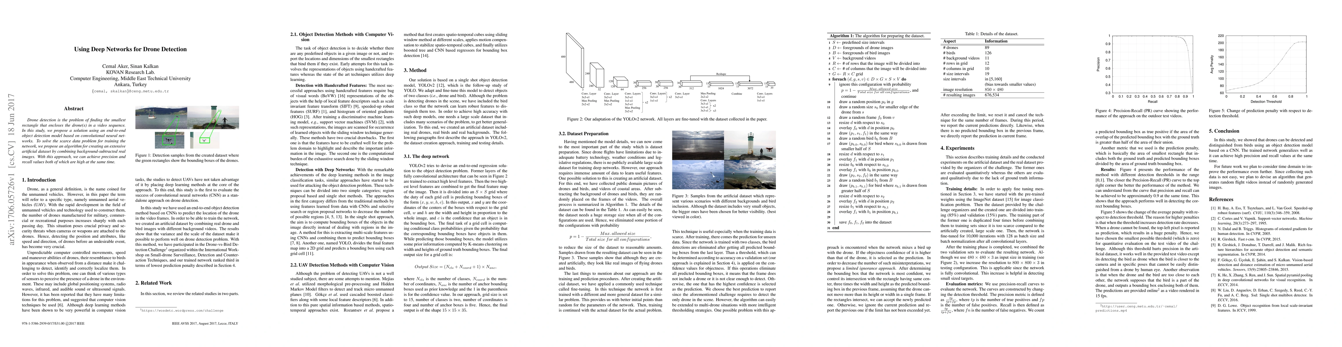 This study proposes a convolutional neural network-based deep learning model for drone detection in video sequences, addressing data scarcity through an algorithm that generates an extensive artificial dataset from background-subtracted real images, achieving high precision and recall.