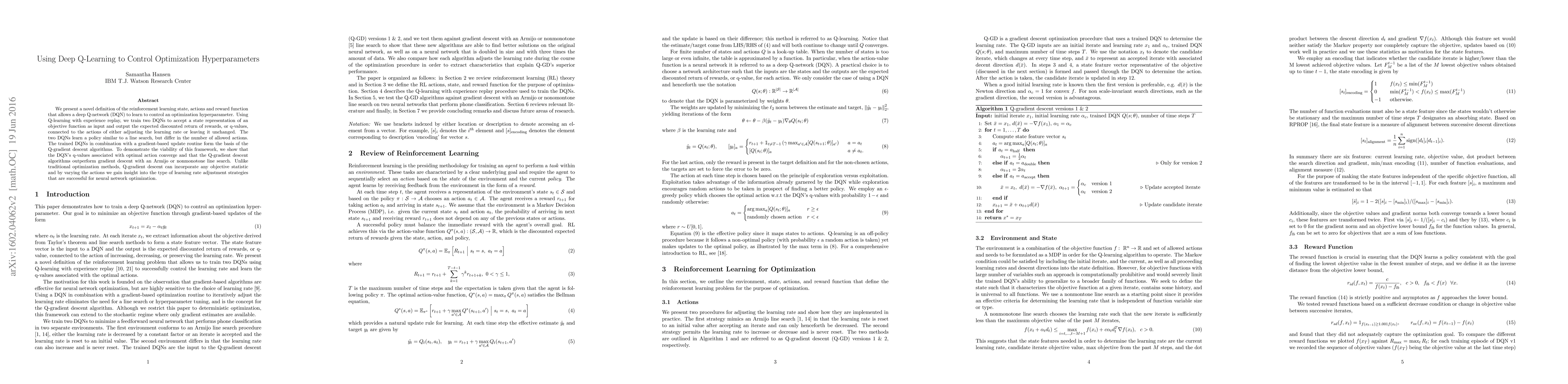 We present a novel definition of the reinforcement learning state, actions and reward function that allows a deep Q-network (DQN) to learn to control an optimization hyperparameter. Using Q-learning with experience replay, we train two DQNs to accept a state representation of an objective function as input and output the expected discounted return of rewards, or q-values, connected to the actions of either adjusting the learning rate or leaving it unchanged. The two DQNs learn a policy similar to a line search, but differ in the number of allowed actions. The trained DQNs in combination with a gradient-based update routine form the basis of the Q-gradient descent algorithms. To demonstrate the viability of this framework, we show that the DQN's q-values associated with optimal action converge and that the Q-gradient descent algorithms outperform gradient descent with an Armijo or nonmonotone line search. Unlike traditional optimization methods, Q-gradient descent can incorporate any objective statistic and by varying the actions we gain insight into the type of learning rate adjustment strategies that are successful for neural network optimization.