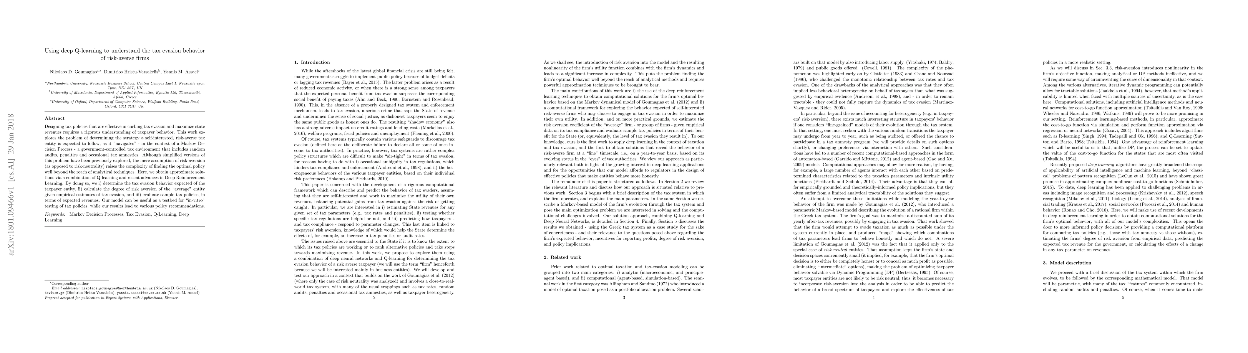This paper uses deep Q-learning to model the tax evasion behavior of risk-averse firms in a tax environment with random audits and penalties. The study evaluates various tax policies to maximize state revenues, providing insights into taxpayer behavior and policy recommendations.