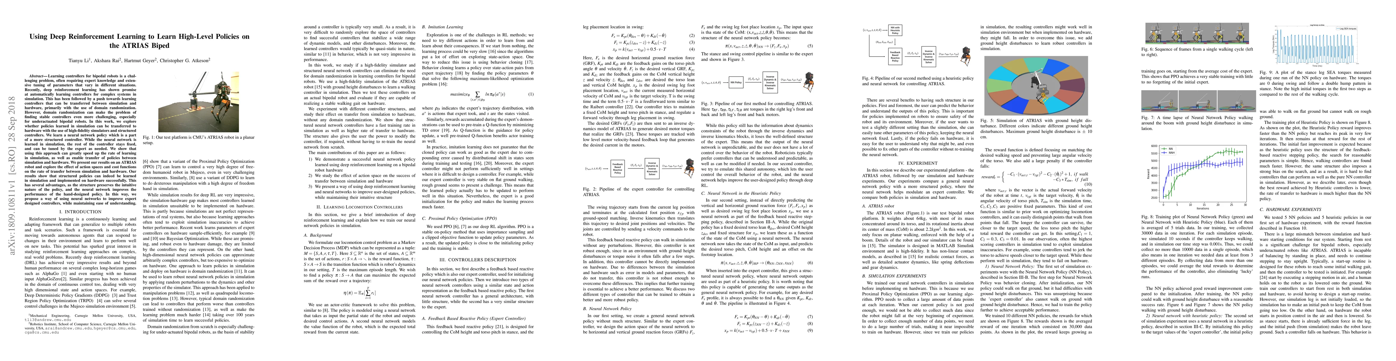 Learning controllers for bipedal robots is a challenging problem, often requiring expert knowledge and extensive tuning of parameters that vary in different situations. Recently, deep reinforcement learning has shown promise at automatically learning controllers for complex systems in simulation. This has been followed by a push towards learning controllers that can be transferred between simulation and hardware, primarily with the use of domain randomization. However, domain randomization can make the problem of finding stable controllers even more challenging, especially for underactuated bipedal robots. In this work, we explore whether policies learned in simulation can be transferred to hardware with the use of high-fidelity simulators and structured controllers. We learn a neural network policy which is a part of a more structured controller. While the neural network is learned in simulation, the rest of the controller stays fixed, and can be tuned by the expert as needed. We show that using this approach can greatly speed up the rate of learning in simulation, as well as enable transfer of policies between simulation and hardware. We present our results on an ATRIAS robot and explore the effect of action spaces and cost functions on the rate of transfer between simulation and hardware. Our results show that structured policies can indeed be learned in simulation and implemented on hardware successfully. This has several advantages, as the structure preserves the intuitive nature of the policy, and the neural network improves the performance of the hand-designed policy. In this way, we propose a way of using neural networks to improve expert designed controllers, while maintaining ease of understanding.