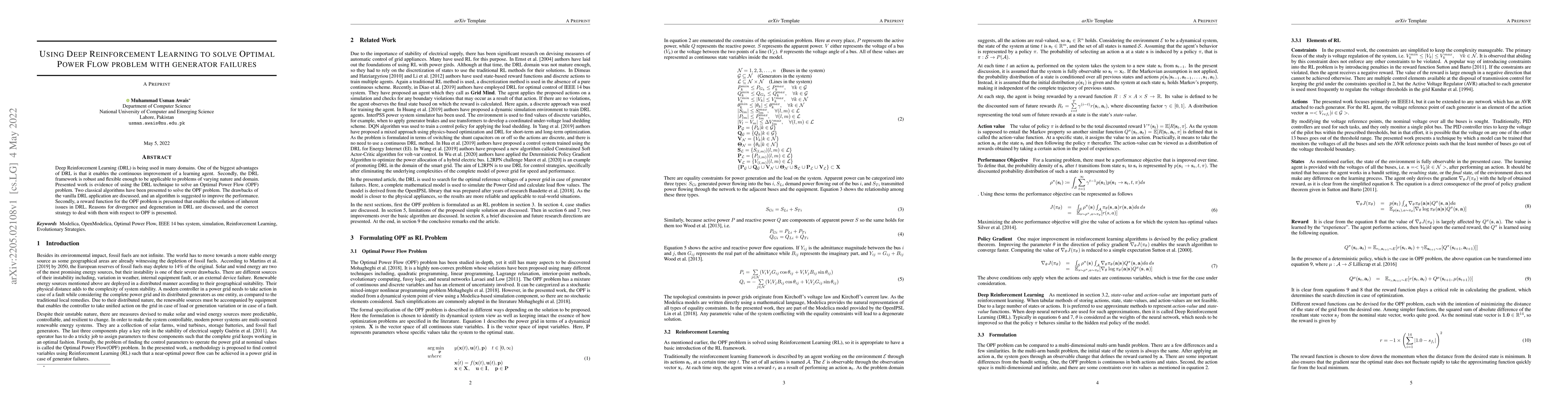 This paper explores using Deep Reinforcement Learning to solve Optimal Power Flow problems with generator failures, proposing a reward function to address inherent issues in DRL.